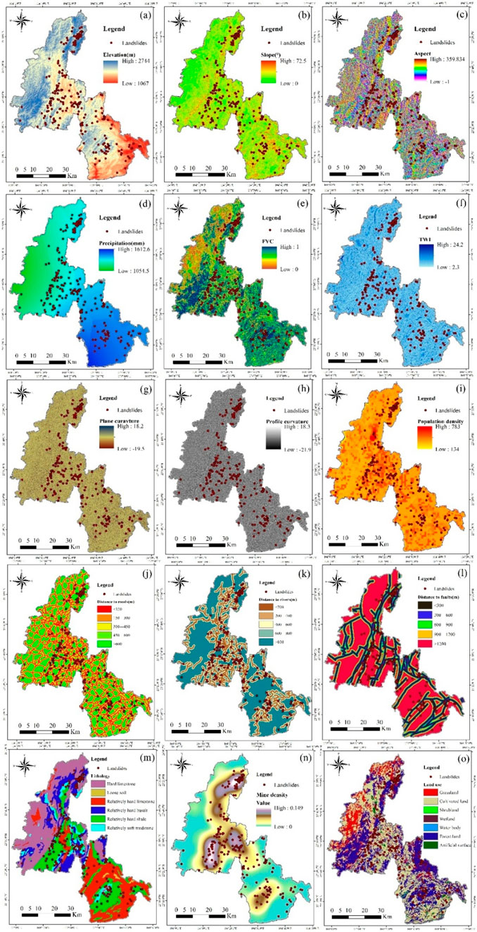 Figure 5. Landslide causal factors: (a) Elevation, (b) Slope, (c) Aspect, (d) Precipitation, (e) FVC, (f) TWI, (g) Plane curvature, (h) Profile curvature, (i) Population density, (j) Distance to roads, (k) Distance to rivers, (l) Distance to faults, (m) Lithology, (n) Mine density, (o) Land use.