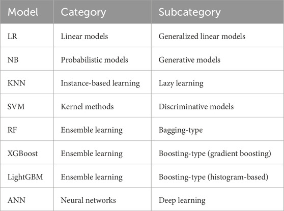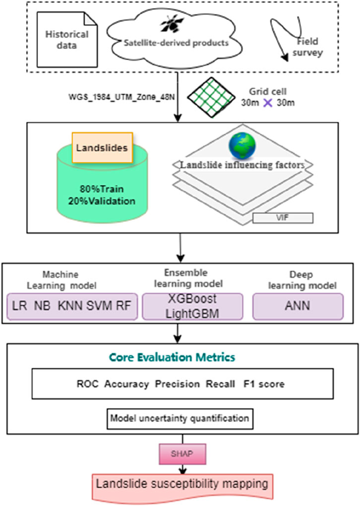 In the field of geology and geotechnical engineering, accurately assessing the stability of underground structures and the mechanical behavior of rock and soil masses has always been a critical challenge. To address this issue, researchers often employ numerical simulation methods based on physical mechanisms (Alsabhan et al., 2021; Rizvi et al., 2020; Ahmad et al., 2021; Ahmad et al., 2019). With advancements in modern society and the rapid development of very high-resolution remote sensing (VHRRS) and geographic information systems (GIS), data acquisition and processing capabilities have been significantly enhanced (Ghayur Sadigh et al., 2024). In previous studies, machine learning (ML) has played a significant role in geological and geotechnical fields (Sahin, 2022; Mandal and Mandal, 2018; Ahmad et al., 2025a; Ahmad et al., 2025b). Concurrently, escalating demands for high-precision LSM have driven the widespread adoption of quantitative ML methods within landslide susceptibility research (Sahin, 2022). Representative algorithms include logistic regression, Naïve Bayes (NB), random forest (RF), support vector machines (SVM), ensemble learning techniques (RF/XGBoost/LightGBM), and deep learning neural networks (Mandal and Mandal, 2018; Ahmad et al., 2025a; Ahmad et al., 2025b; Shang et al., 2025; Kalantar et al., 2018; Badapalli et al., 2025; Zhao et al., 2021; Van Westen et al., 2008; Le et al., 2024; Moayedi et al., 2019; Ahadi and Rosta, 2024; Abgrami et al., 2025; Guo et al., 2023). These ML models excel at capturing complex nonlinear relationships among multiple predisposing factors, operate without stringent parametric assumptions when processing extensive datasets, and deliver significantly enhanced predictive accuracy compared to conventional approaches.