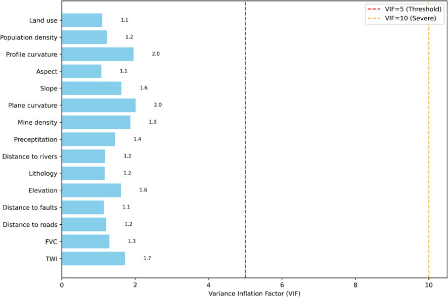 Modern machine learning algorithms (e.g., decision trees, neural networks, kernel methods) inherently capture nonlinear feature interactions, with L1/L2 regularization and Dropout effectively suppressing linearly redundant feature adverse effects. Since Pearson correlation coefficients only detect linear associations, this study uses VIF detection instead. In applications like landslide susceptibility mapping, VIF is a critical diagnostic tool for model robustness and interpretability (Guoliang et al., 2021). In our modeling, this approach ensured parsimonious geomorphological variable selection while maintaining computational efficiency when integrating multi-source topographic, geological, and hydrological data. The VIF <5 threshold was adopted based on empirical machine learning studies and geohazard modeling domain considerations.