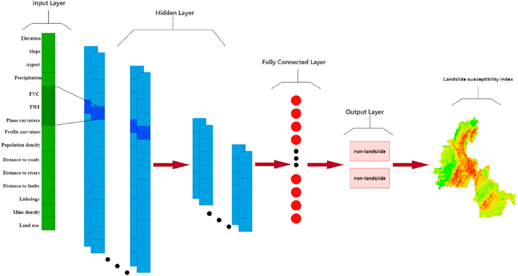 The ANN, originally for handwritten digit recognition, is a specialized neural network architecture particularly suited for processing grid-structured data (Haykin, 1994). In this study, we directly employ the ANN model as a classifier for landslide susceptibility prediction. The implementation involves three main steps: 1) transforming raw landslide data into three-dimensional data structures; 2) constructing corresponding ANN architectures tailored to different data dimensions; and 3) conducting susceptibility analysis based on these dimension-specific data and ANN structures. For clarity, we illustrate the analysis process using a 1D-ANN architecture (Figure 8). The 1D-ANN takes 15 × 1 factor vectors as input. Through convolutional and pooling operations in the hidden layers, it extracts high-dimensional landslide features. These features are then mapped to a lower-dimensional space via fully connected layers and finally transformed into the sample label space through nonlinear activation functions, outputting both landslide/non-landslide classifications and their corresponding probability values (Landslide Susceptibility Index, LSI). By applying this 1D-ANN model to predict susceptibility indices for each grid cell, we generate the final landslide susceptibility map.