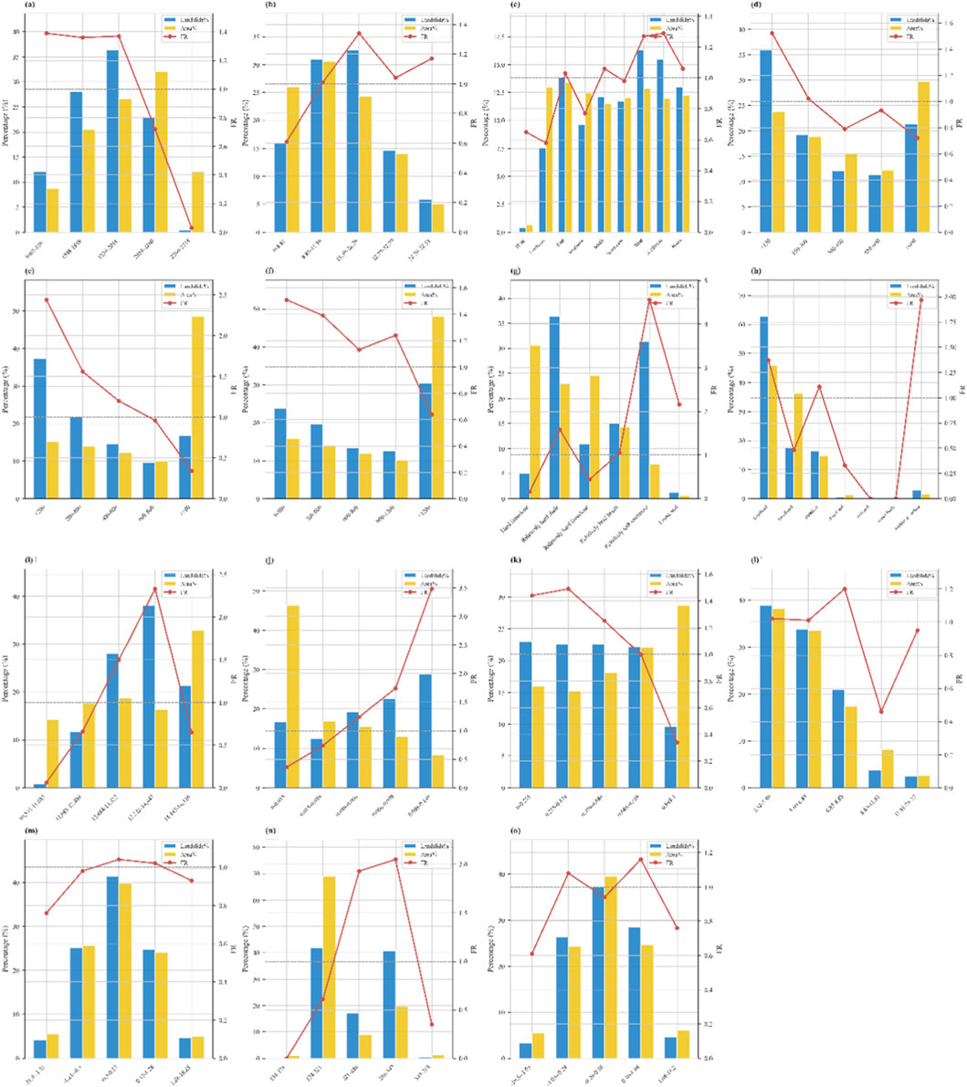 Figure 9. FR analysis of landslide-influencing factors: (a) Elevation, (b) Slope, (c) Aspect, (d) Distance to roads, (e) Distance to rivers, (f) Distance to faults, (g) Lithology, (h) Land use, (i) Precipitation, (j) Mine density, (k) FVC, (l) TWI, (m) Profile curvature, (n) Population density, (o) Plane curvature.