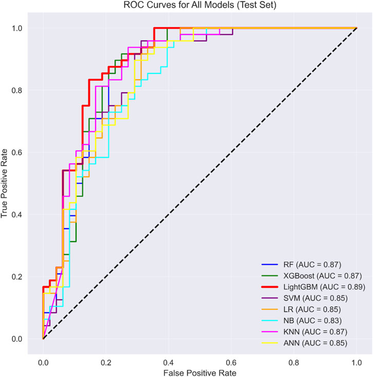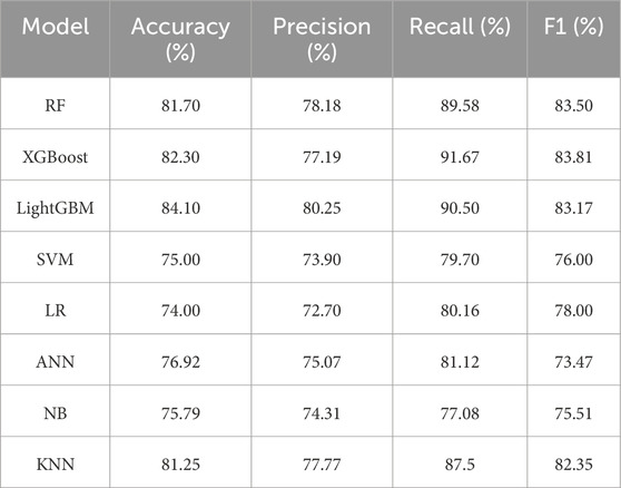 Table 3 presents performance metrics (accuracy, precision, recall, F1 - score) of ML models. LightGBM achieved the highest accuracy (84.10%) and precision (80.25%), with recall at 90.50% and F1 at 83.17%. XGBoost followed, with accuracy of 82.30%, recall reaching 91.67%, and F1 at 83.81%. RF (81.70% accuracy) and KNN (81.25% accuracy) showed competitive results. Conversely, SVM, LR, NB, and ANN exhibited lower performance across metrics. Overall, gradient - boosting (LightGBM, XGBoost) and ensemble (RF) models outperformed traditional (SVM, LR) and ANN approaches, with LightGBM demonstrating the most balanced predictive capability.