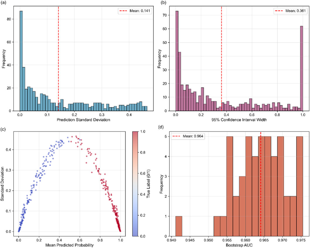 Figure 11. Uncertainty Quantification Results: (a) Prediction Uncertainty Distribution; (b) Confidence Interval Width Distribution; (c) Probability vs. Uncertainty; (d) Model Stability (Bootstrap AUC).