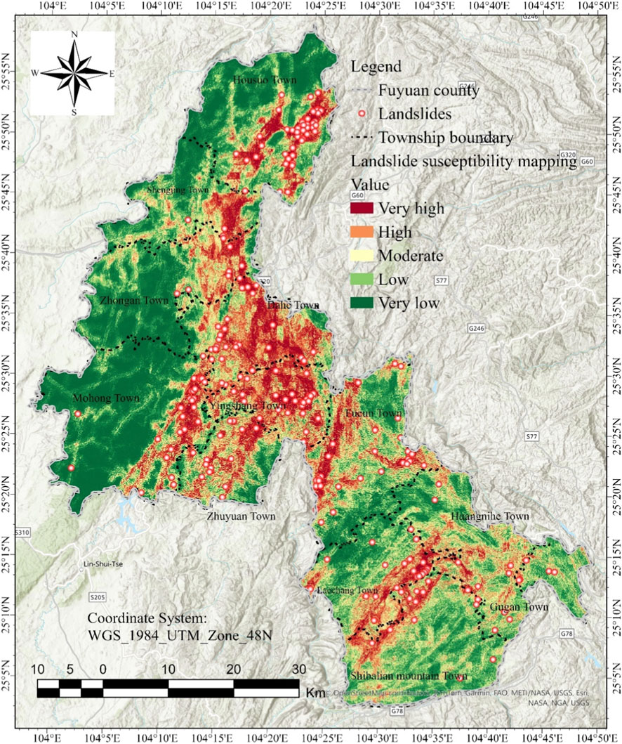 High and Very high susceptibility zones (depicted in red and dark red) are concentrated in certain townships, such as Yingshang Town and parts of Dahe Town and Zhuyuan Town. These zones coincide with a significant number of recorded landslides (marked as red dots), indicating the model’s ability to identify areas prone to landslide occurrences. In contrast, the southern and some western townships (e.g., Mohong Town, Zhongan town, Shibalian mountain Town) are dominated by Low and Very low susceptibility zones (shown in green), where fewer landslides are observed.