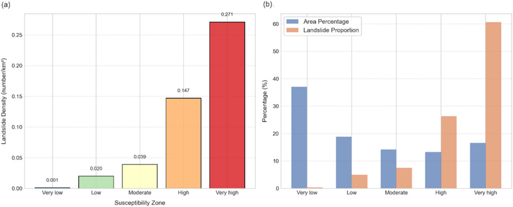 Figure 13. Spatial distribution characteristics of landslides across susceptibility zones: (a) Landslide density by zone; (b) Area vs. landslide Proportion.