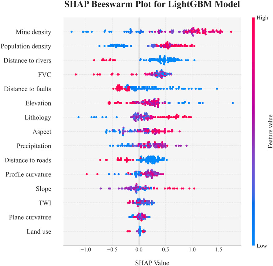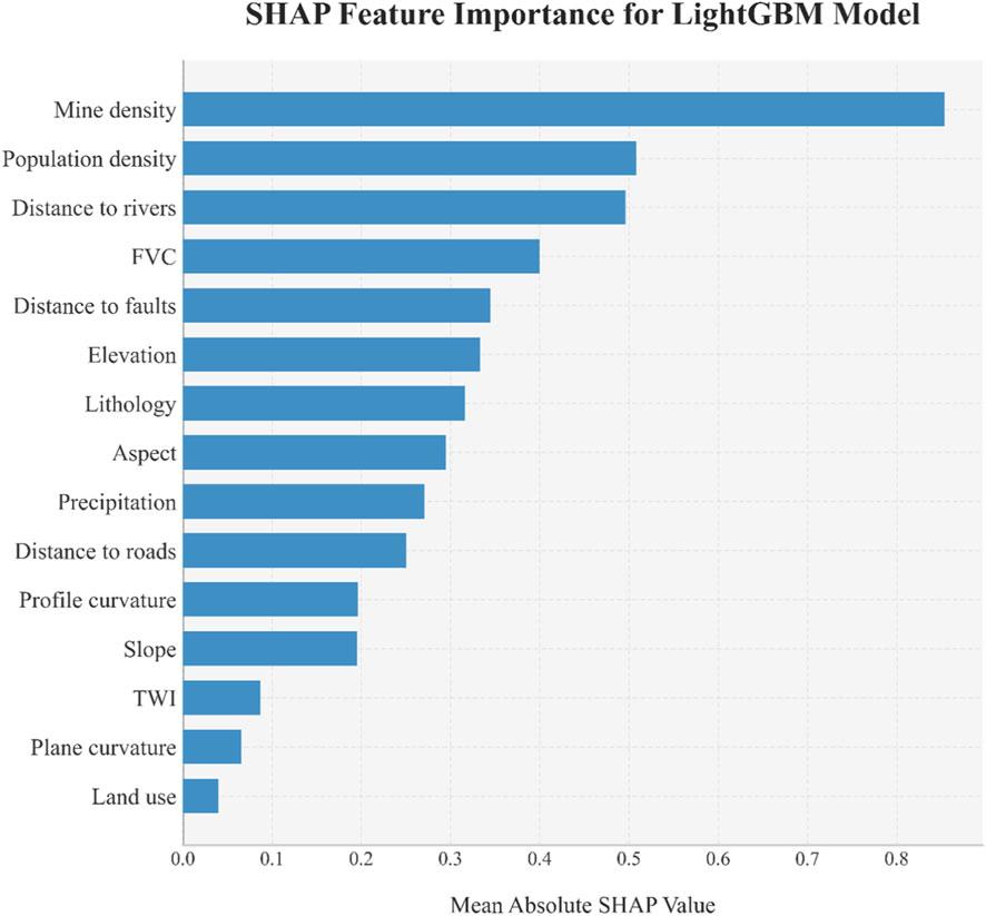 Mine density shows a wide SHAP value spread, indicating a critical role. Population density and distance to rivers also have notable influences, seen from their SHAP value ranges. Features like FVC, distance to faults, and elevation contribute variably, per their distinct SHAP distributions. Overall, the plot reveals how mine-related and geospatial factors (e.g., mine density, population density) drive the LightGBM model’s susceptibility assessments, clarifying key feature-prediction relationships.