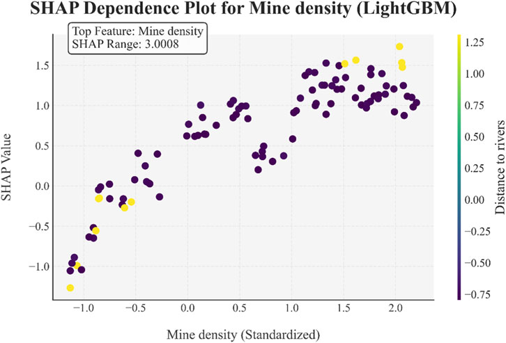 The SHAP dependence plot for mine density in the LightGBM model (Figure 15) illustrates the relationship between standardized mine density, SHAP values, and the interacting feature of distance to rivers (color - coded). As standardized mine density increases, SHAP values generally show an upward trend, indicating a positive influence on the model’s prediction of landslide susceptibility. Notably, at higher mine density values (especially >0.5), SHAP values are predominantly positive and exhibit greater variability, suggesting a stronger and more complex impact on predictions. The color gradient reveals that instances with shorter distances to rivers (warmer colors, e.g., yellow) often coincide with higher SHAP values at given mine densities, implying a synergistic effect: areas with both high mine density and proximity to rivers may face elevated hazard potential, as captured by the LightGBM model. This interaction highlights the importance of considering combined feature effects in interpreting the model’s output.