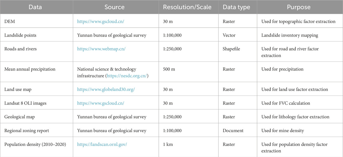 In landslide susceptibility assessment, the selection of input factors directly determines the variable types and predictive accuracy of the model. Based on an in-depth analysis of landslide mechanisms and previous studies (Shang et al., 2025; Kalantar et al., 2018), this study systematically selects 15 variables across five categories: topographic (elevation, slope, aspect, plan curvature, profile curvature), geological (lithology, distance to faults), hydrological (distance to rivers, precipitation, TWI), environmental (FVC, land use), and anthropogenic (mine density, population density, distance to roads). These factors comprehensively cover the primary controls and triggering mechanisms of landslides, ensuring the model’s scientific rigor and completeness. Categorical variables are classified based on their original data sources, while continuous variables are retained in their raw form to meet the requirements of machine learning algorithms. Data sources are detailed in Table 1.