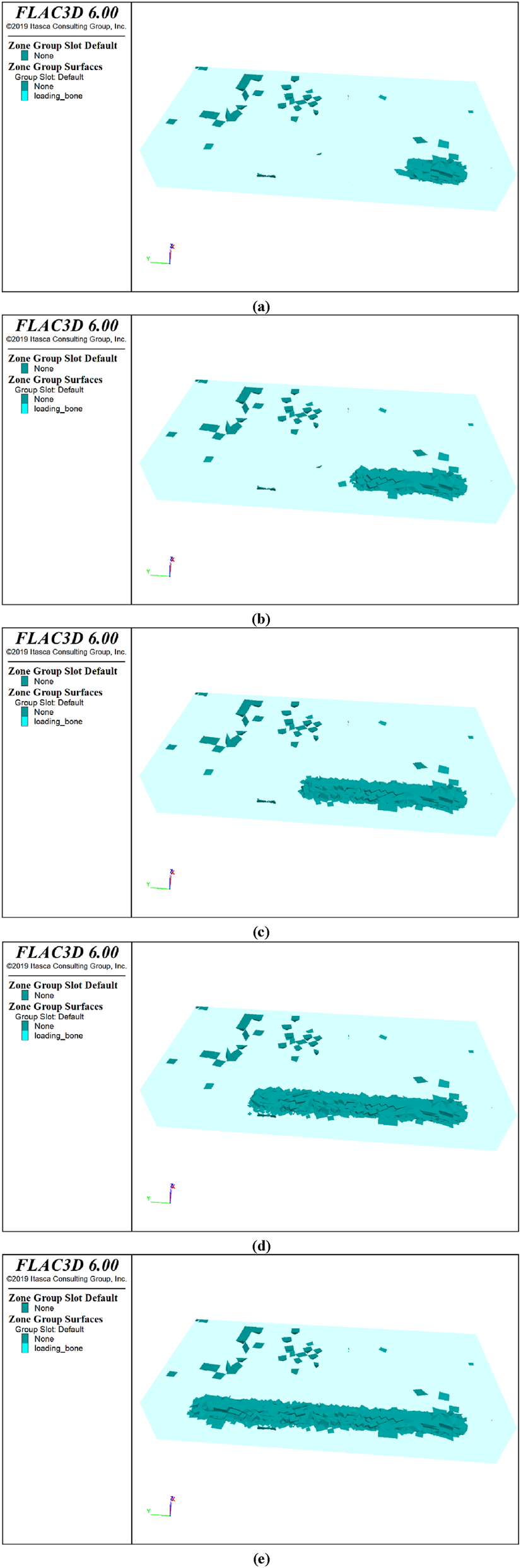Plastic zone of 22,214 working face at different advancements: (a) 800 m, (b) 1,600 m, (c) 2,400 m, (d) 3,200 m of advance, and (e) after full extraction.