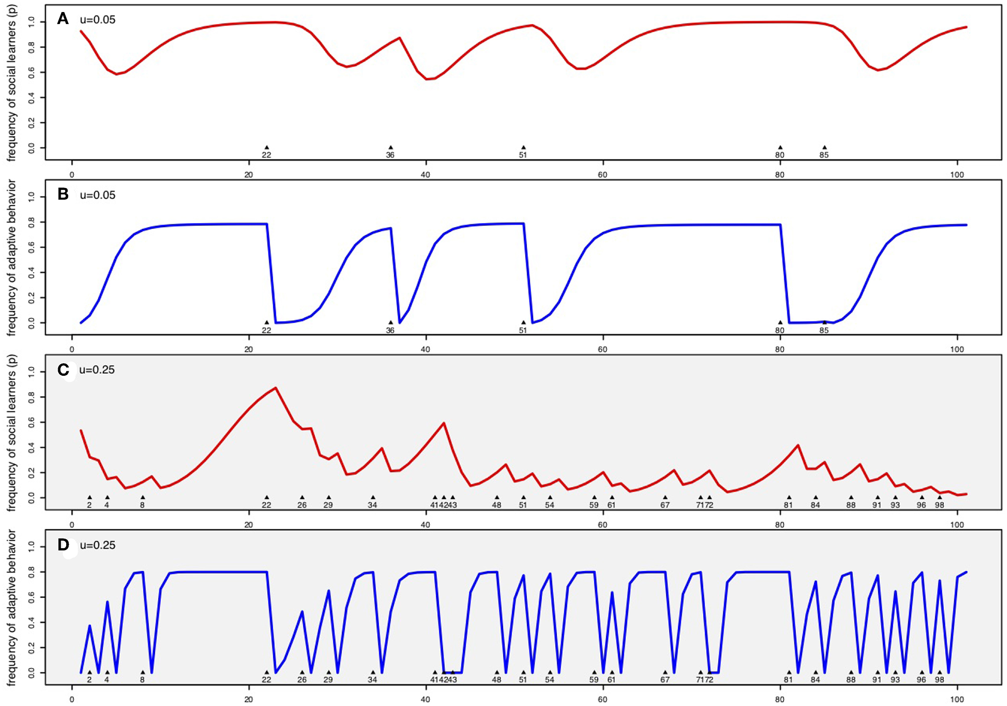 These dynamics are illustrated in more detail in Figure 2. In the first time step after each environmental change (before individual learners can innovate), the frequency of adaptive behavior drops to zero (Figures 2A,C in blue). Social learners thus learn the old, now maladaptive, behavior which decreases their fitness to baseline and decreases their frequency in the population relative to individual learners (Figures 2B,D in red). Each successive environmental change is marked by a number indicating the timestep and an arrow on the x-axis. Panels a and b show these dynamics in a relatively stable environment (u = 0.05), while c and d show dynamics in a more rapidly changing environment (u = 0.25). At the beginning of the simulation, the population is at , the steady state of the frequency of adaptive behaviors specified in Equation 4.