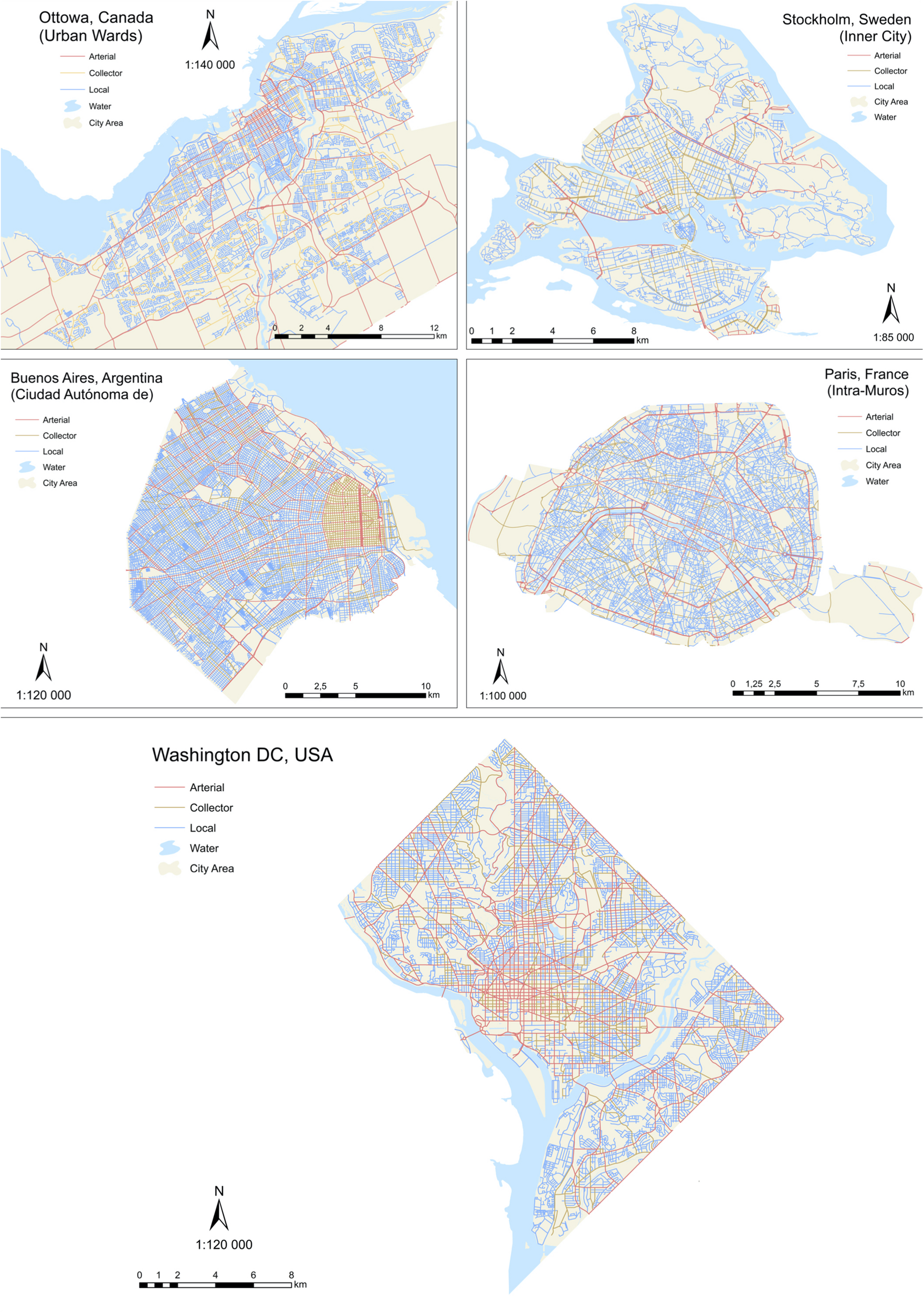 To establish a consistent hierarchy of streets, the street network in each city was normalized to three classes commonly used in traffic engineering: local, collector, and arterial (USDOT, 2013; European Commission, 2020). In all cities except Paris, these functional classes were provided by local authorities. In Paris, OpenStreetMap data was used because the local authority does not use functional classes. The determination of the classification of street segments in each city was based on the cities’ respective GIS attribute tables that most closely corresponded to a hierarchical classification of local, collector, and arterial streets. For example, in the local inventory created in Ottawa, streets were separated into 14 subclasses; in Stockholm, streets were graded numerically into 10 classes; in Buenos Aires, five hierarchical network categories were used; in Washington, DC, seven functional labels were used; and in the open-source data used in Paris, 32 roadway type labels were used. After reclassifying these heterogenous labels into local, collector, and arterial streets, the data in each city was ground truthed using Google Earth and Google Maps to confirm that the street classes were consistent across the cities. The resulting street classes are included in the maps of each city (Figure 1).