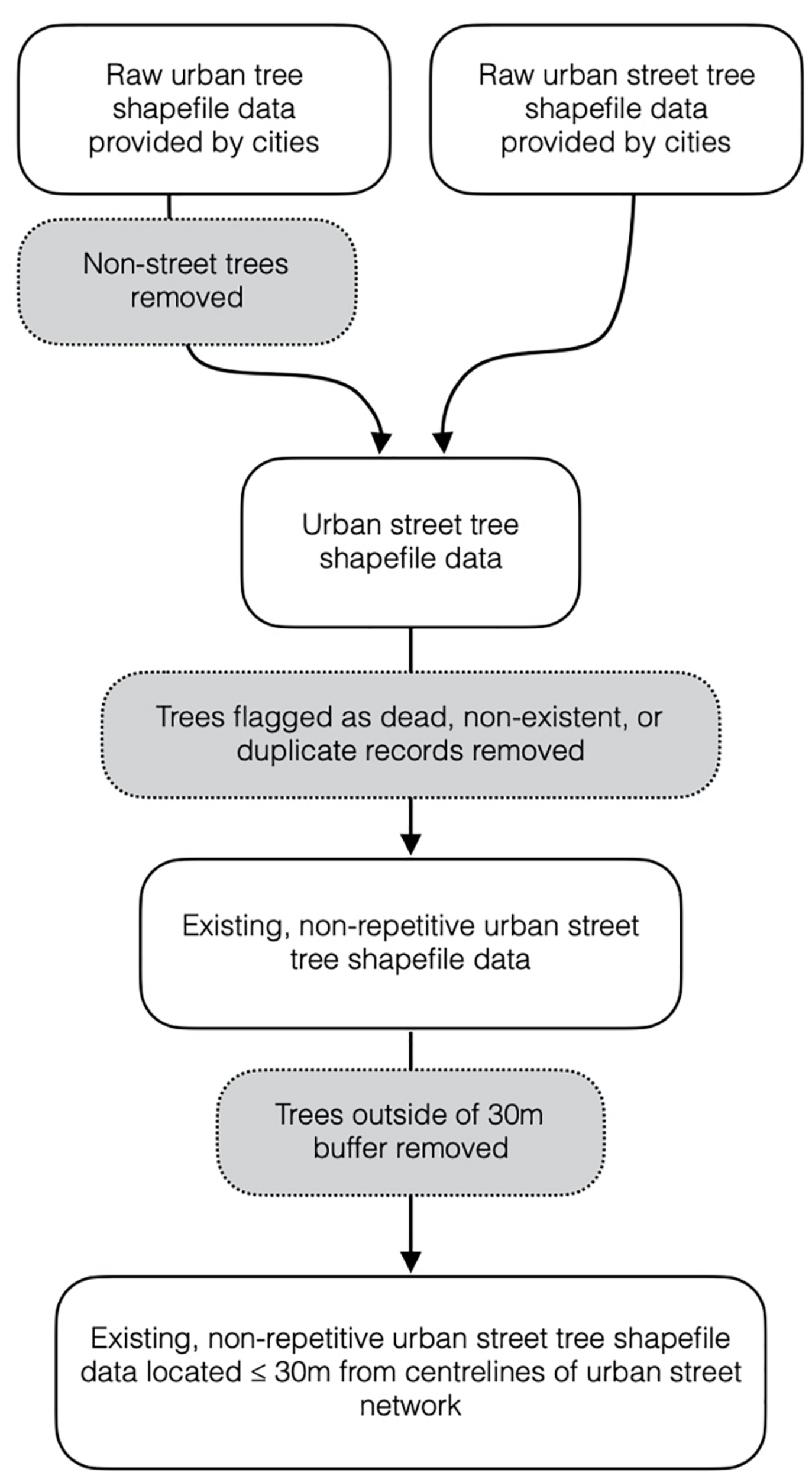 Urban tree inventory research has emerged over the past four decades and has grown to encompass a variety of methods, including satellite-assisted data collection, airplane-assisted data collection, and both ground-level photography and manual visual inspection methods (Nielsen et al., 2014). In our study, spatial data for trees, streets, jurisdictional areas, and bodies of water (used to identify bridges) in each city were obtained from open data portals and third-party sources including public institutions, municipalities, national governments, and research organizations (see Table 1). The exception to this is the street dataset for Paris, the content of which was sourced from OpenStreetMap (OpenStreetMap, 2019).