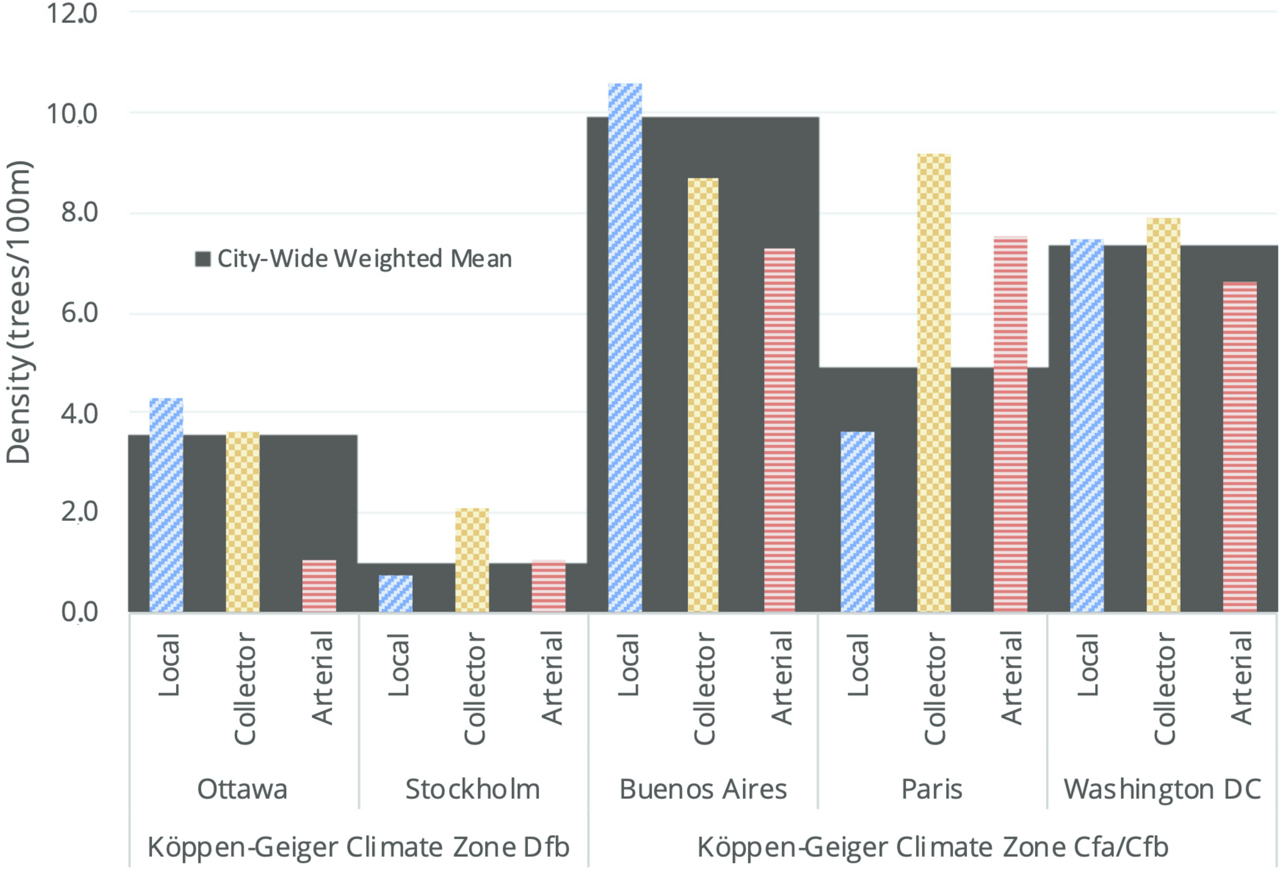 In the cooler climate zone, the city-wide density of Ottawa (3.5 trees/100 m) was over three times greater than that of Stockholm (1.0 trees/100 m). Much of the difference in the city-wide density of the cities can be attributed to the local street class in the two cities (Ottawa averaged 4.3 trees/100 m and Stockholm averaged 0.8 trees/100 m), in contrast to the similar densities of the arterial street class in each city (1.1 and 1.0 trees/100 m, respectively). In the warmer climate zone, Buenos Aires, Paris, and Washington, DC exhibited marked differences in street tree density on local streets (10.6, 3.6, and 7.5 trees/100 m, respectively) but similar densities on collector streets (8.7, 9.2, and 7.9 trees/100 m, respectively) and arterial streets (7.3, 7.5, and 6.6 trees/100 m, respectively).