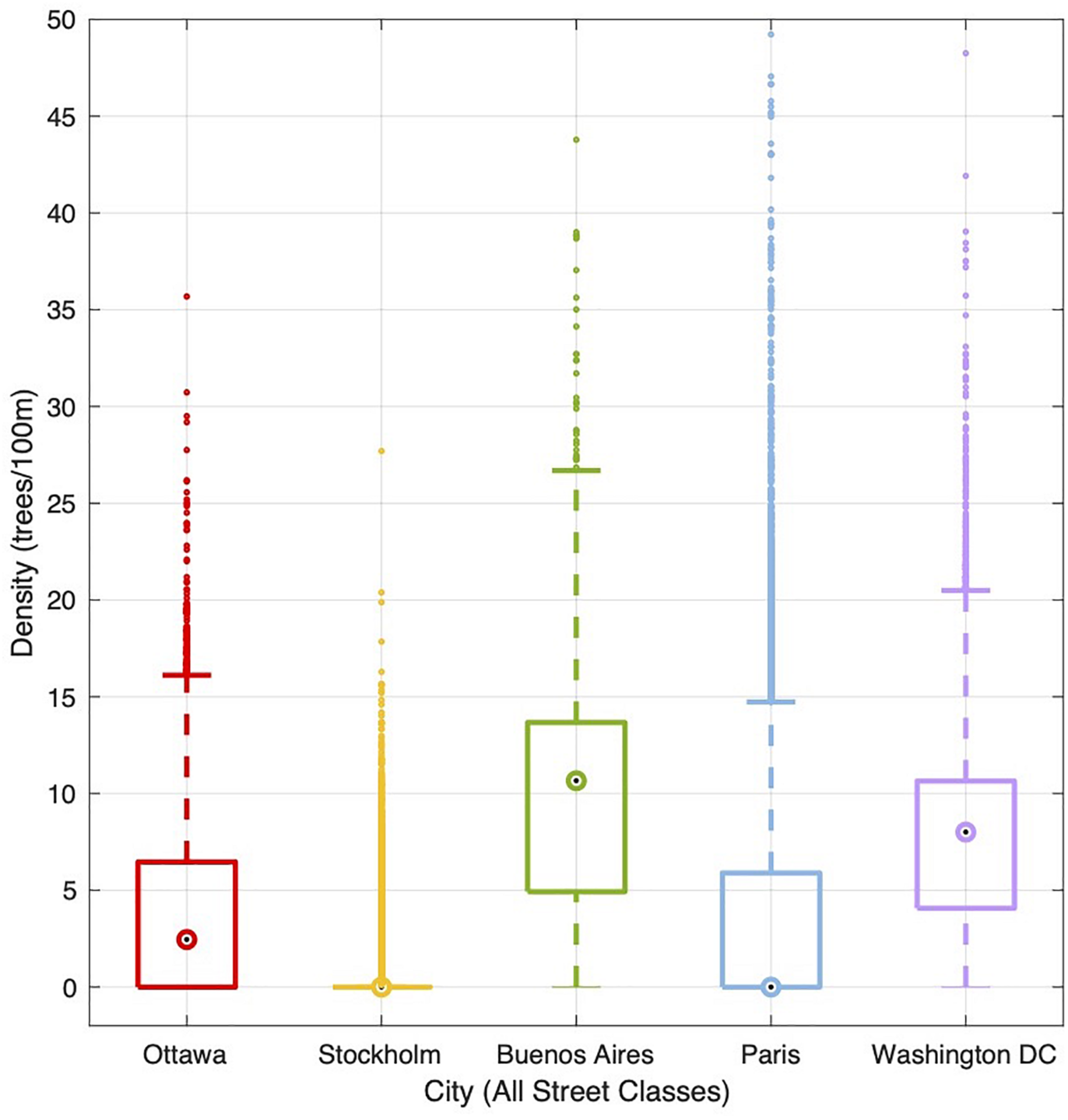 Arterial streets in Ottawa had a lower street tree density than the collector and local streets. The local streets comprise 66% of the total street network and the average of 4.3 trees/100 m is almost four times greater than the arterial streets (1.1 trees/100 m). Stockholm’s collector streets (2.1 trees/100 m) had a higher street tree density than local and arterial streets (0.8 and 1.0 trees/100 m, respectively). Reflecting the city’s large number of treeless street segments, the median value of all street classes in Stockholm is 0 trees/100 m. Buenos Aires’ local streets had a slightly higher street tree density (10.6 trees/100 m) than its collector (8.7) and arterial (7.3) streets. The street network of Buenos Aires is largely composed of local streets (74% by network length) and has a street tree density of 10.6 trees/100 m. Collector streets in Paris had a higher street tree density (9.2 trees/100 m) than local and arterial streets, although local streets account for a larger proportion (73%) of the city’s total street network, and have a much lower weighted mean (3.6 trees/100 m). Outliers in the Paris dataset are abundant and thus, there is a wide range of street tree densities on individual street segments (Figure 4). In Washington, DC, local, collector, and arterial streets exhibited comparable linear street tree densities (7.5, 7.9, and 6.6 trees/100 m, respectively), exhibiting the most consistent street tree distribution of all of the cities studied. As with the other cities, the local streets accounted for the largest proportion (62%) of the city’s street network by length and have the highest weighted mean (7.5 trees/100 m).