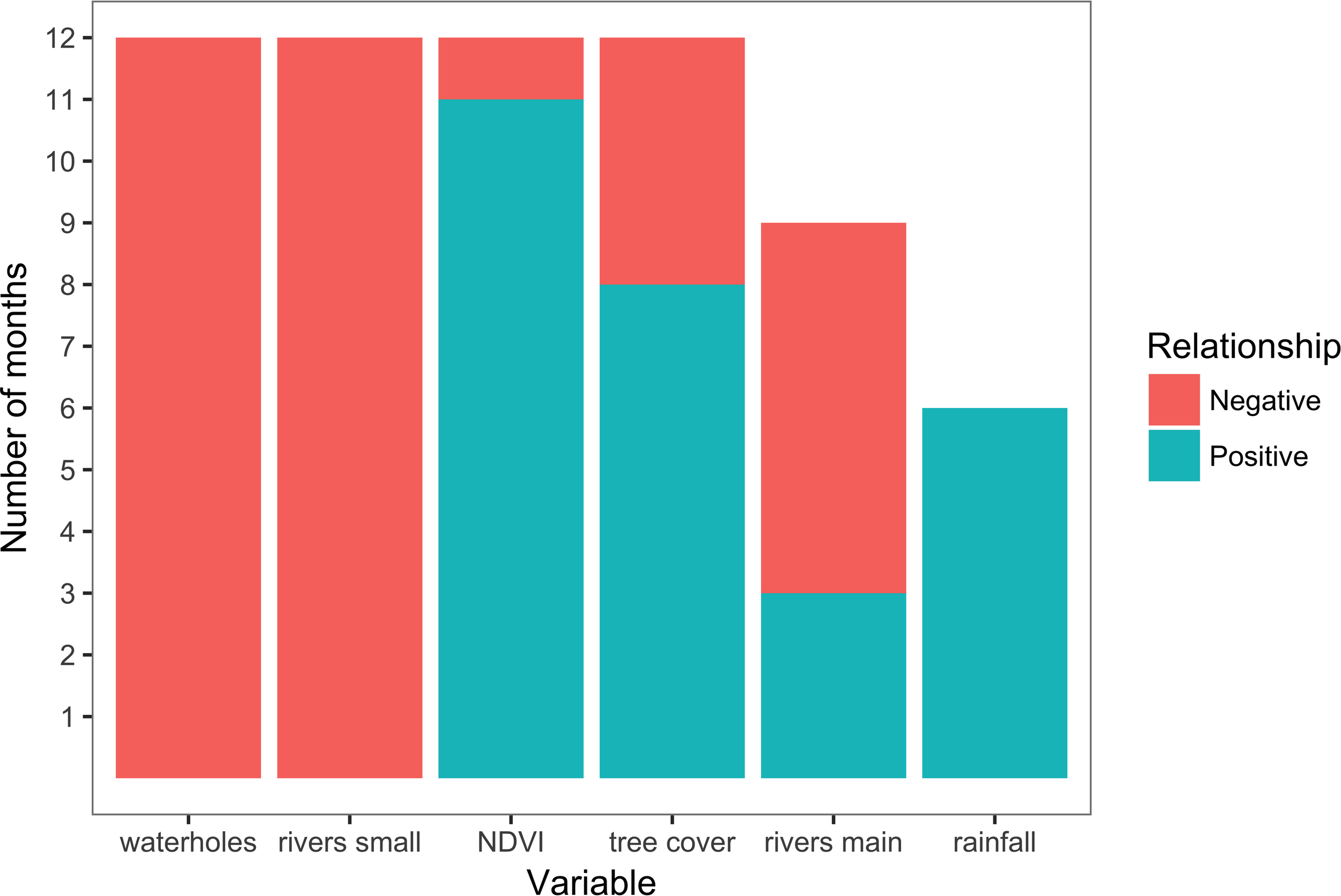 We compared all the monthly movement models by quantifying the consistency of variables in these models over time. We generated a histogram of variable frequency, showing presence of each variable in the path selection model, and the sign of its coefficient. We then tested the influence of each variable on the performance of the monthly models by calculating the difference in predicted resistance to elephant movement when the variable increases from the 10th to 100th percentile, and holding all other variables constant at their medians.