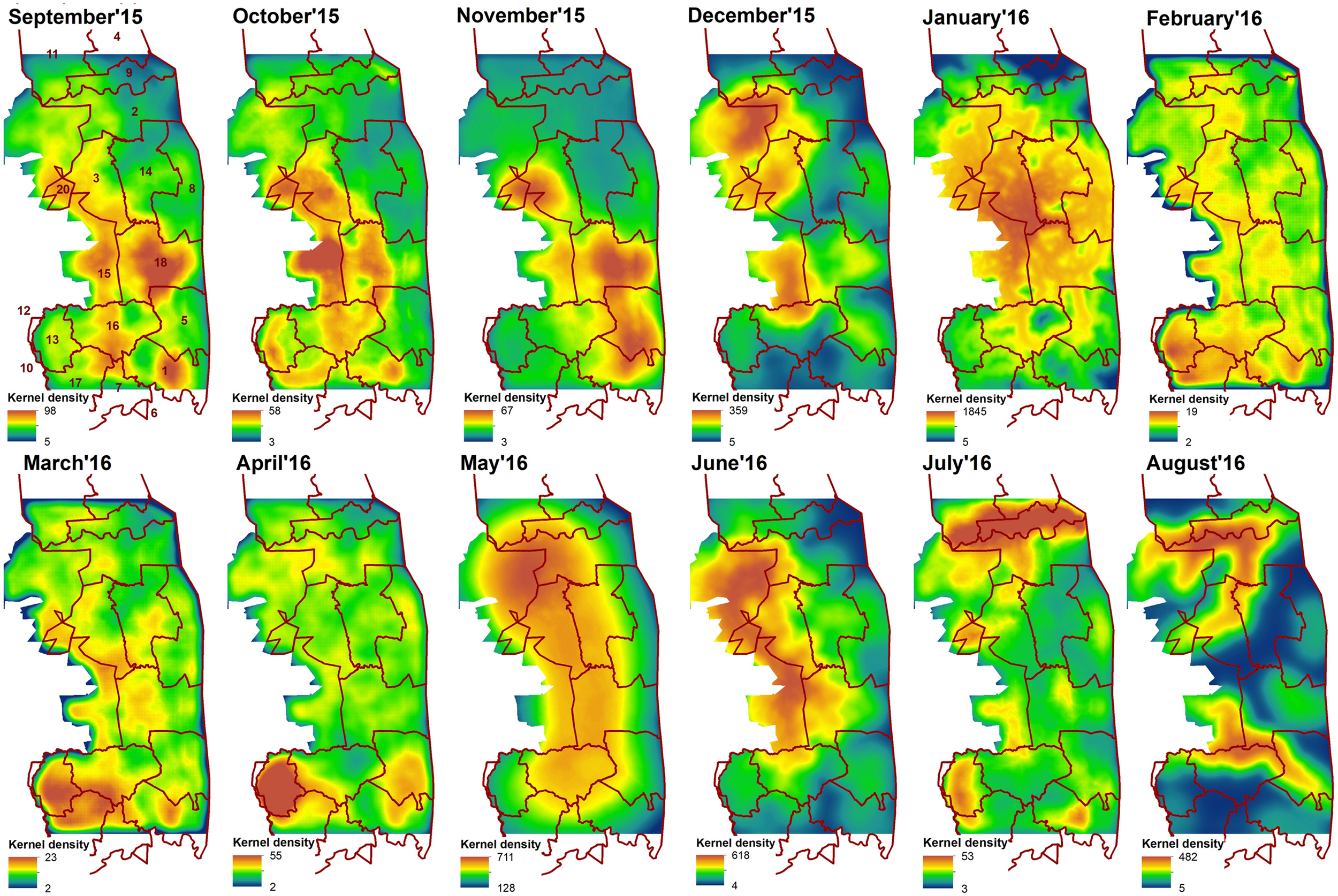 To compare connectivity surfaces across months, we evenly distributed 4,500 source points across the study area, with distance between points of circa 1.5 km. This represents approximately 25% of the park’s elephant population, which was estimated in 2015 to be approximately 17,000 individuals (Ferreira et al., 2017). We explicitly controlled the distribution of source points to only show the effect on connectivity given the same set of points, and to separate the effect of habitat suitability. Furthermore, a lower number of source points in comparison to the total population size does not impact the results which are interpreted relatively and are proportionally comparable across months, and it significantly decreases the processing time of cumulative resistance kernels analyses. We used the source point layer, and the 12 resistance surfaces from each months’ path selection function as inputs to resistant kernel analysis (Compton et al., 2007) in UNICOR (Landguth et al., 2012). The cumulative resistant kernel generates a prediction of the total movement density across the landscape to identify the main pattern of synoptic connectivity, reflecting the connectivity of every location relative to every other location in the landscape (Cushman et al., 2013; Kaszta et al., 2018). This is done by summing all individual least-cost kernels from all dispersal source points (Compton et al., 2007). The real dispersal threshold for elephants, as for a majority of species, is unknown. Therefore, for a sensitivity analyses we tested two dispersal distance thresholds, 250,000 and 500,000 cost units (dispersal distance in cost units), which in our analysis represent movement of 25 and 50 km in the uniform landscape of resistance equal to 10 (10% of the maximum resistance value = 100).