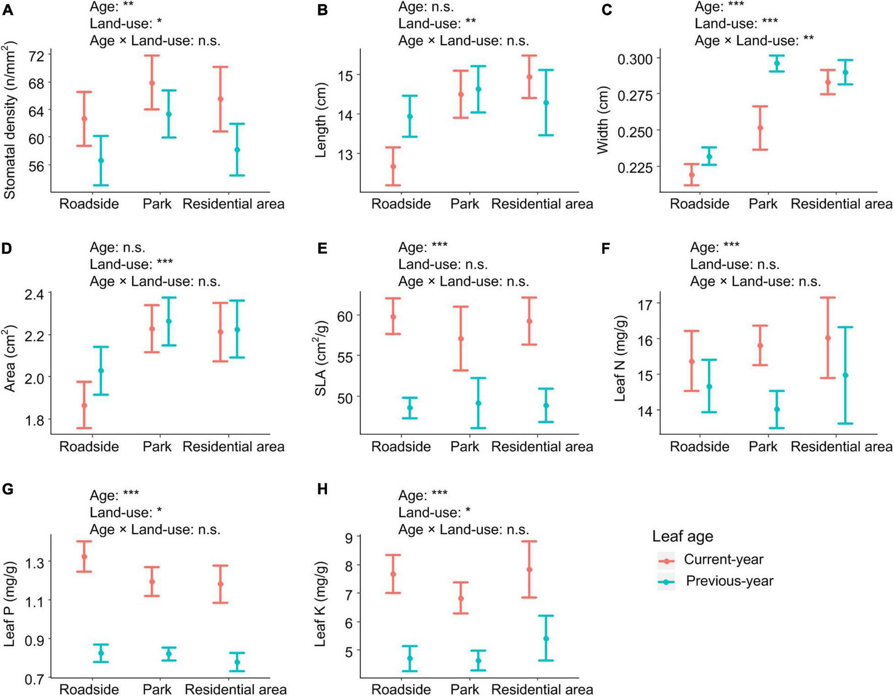 Leaf functional traits (mean values and 95% confidence intervals) of Chinese pine (Pinus tabuliformis Carr.) differ with leaf age and among land-use types. (A) Stomatal density, (B) Leaf length, (C) Leaf width, (D) Leaf area, (E) Specific leaf area, (F) Leaf N concentration, (G) Leaf P concentration, (H) Leaf K concentration. Significance level: ***p < 0.001; **p < 0.01; *p < 0.05; n.s., not significant.
