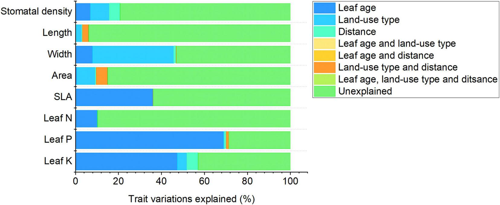 Variation partitioning analysis was performed using the ‘‘varpart’’ function in the ‘‘vegan’’ package to compare the percentage of trait variations explained by leaf age, land-use type, urban–rural gradient, and their intersections. Statistical analyses were performed using the statistical software R v. 3.6.21 and SAS v. 9.4 (SAS Institute, Cary, NC, United States).