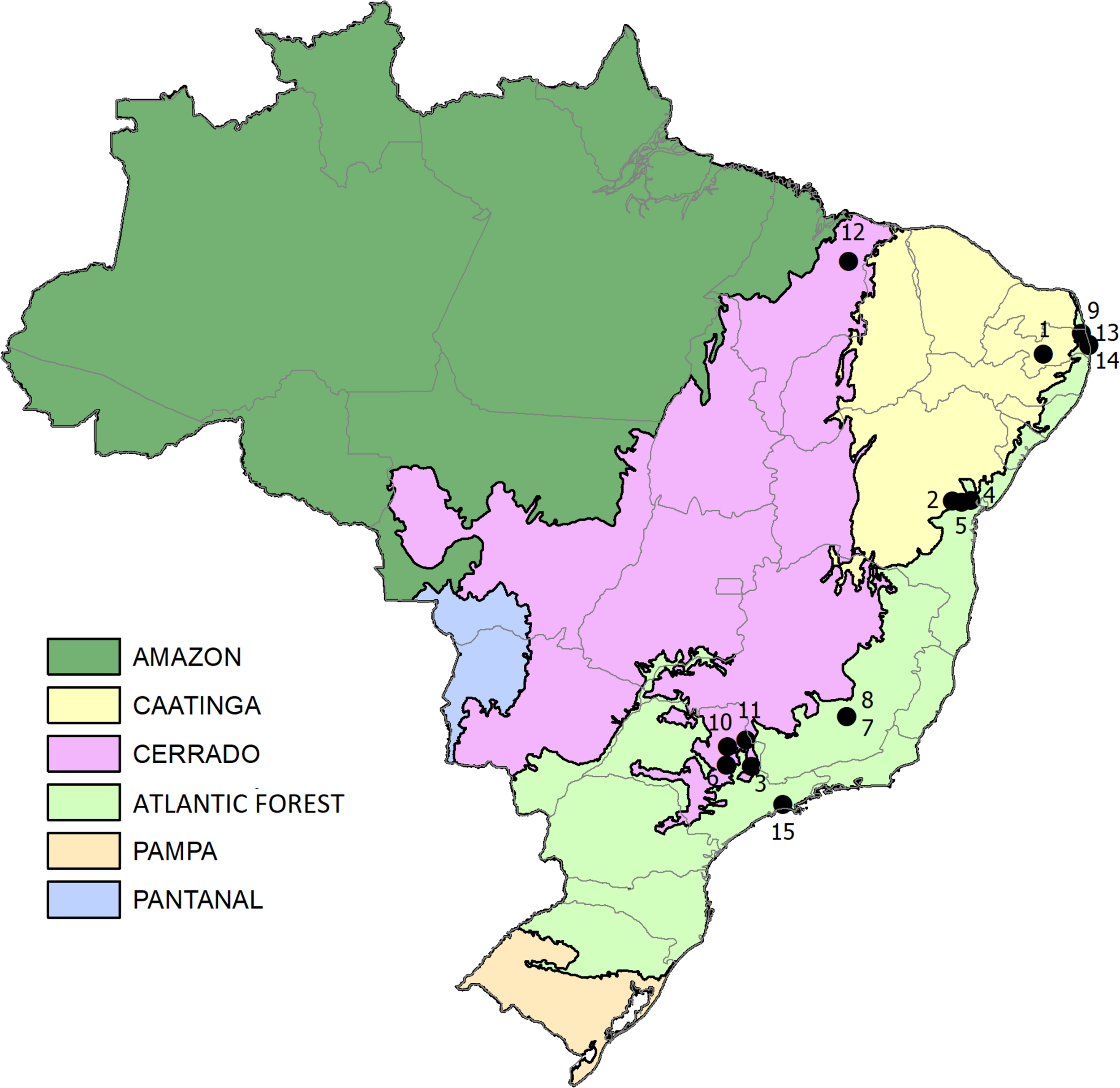 Studies conducted in Brazil on interaction networks between bees and plants were compiled previously (Giannini et al., 2015). All studies followed standardized sampling procedures suggested by Sakagami et al. (1967), in which the researcher observes each plant in a pre-established transect for a fixed time (3–5 min) and collects all the bees observed using an entomological net, repeating this procedure monthly for at least one year. The interaction networks were represented as a set of nodes (species) connected through links, with each link representing an observed interaction (Bascompte and Jordano, 2007). We included surveys that determined the number of bees sampled per plant to construct fifteen quantitative networks. These networks belong to some of the most important Brazilian biomes (Figure 1). The nomenclature and systematic identification of the bees followed that of Moure’s Bee Catalog1, and plant identification was in accordance with the Missouri Botanical Garden’s Tropicos information system2.