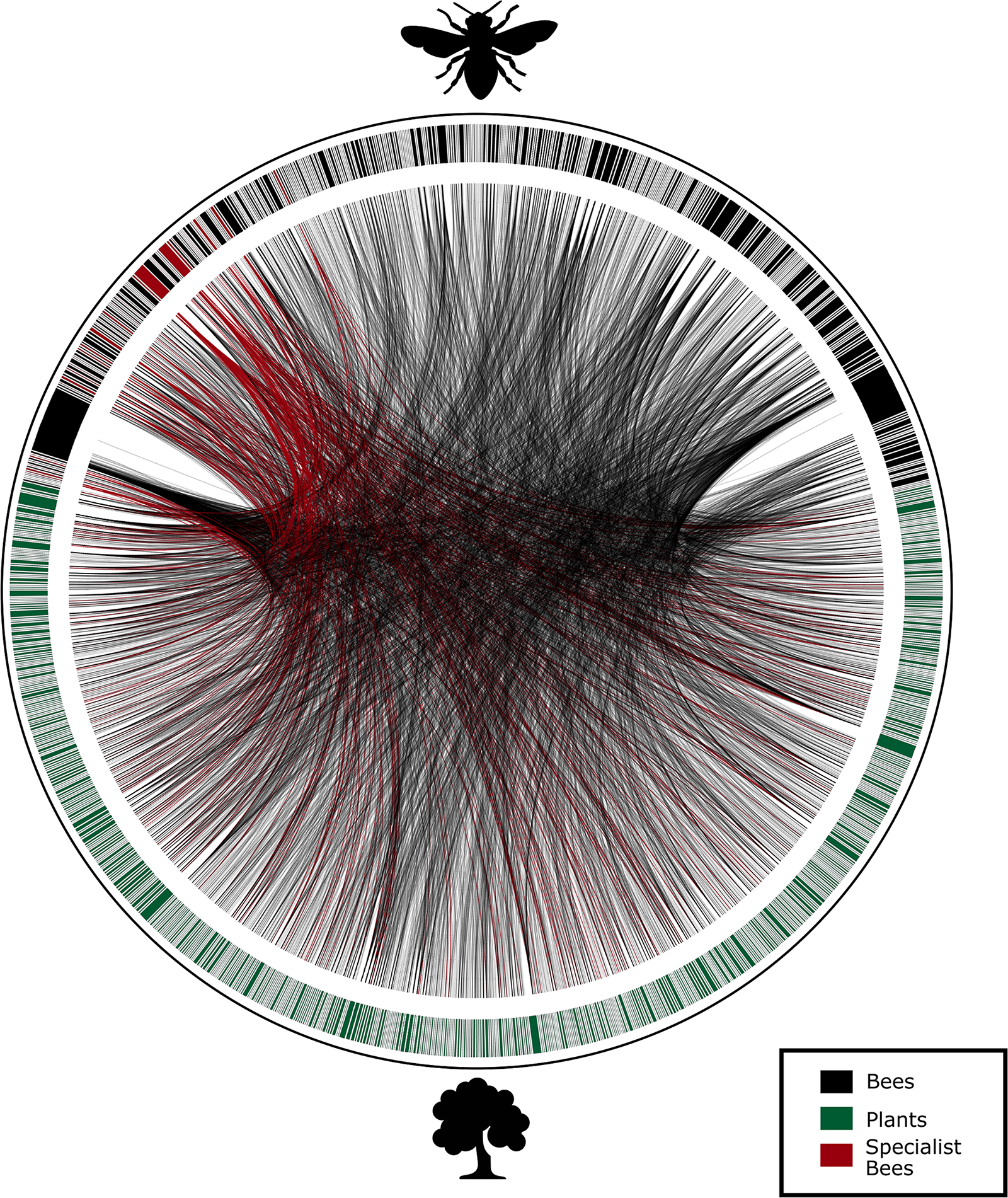 The plant–bee interaction network compiled from all the data analyzed from 15 interaction networks surveyed in three different Brazilian Biomes. All non-specialist bee species are represented in black, all plants in green and all specialist bees and their links are in red. Network plot was generated with Circos (Krzywinski et al., 2009).