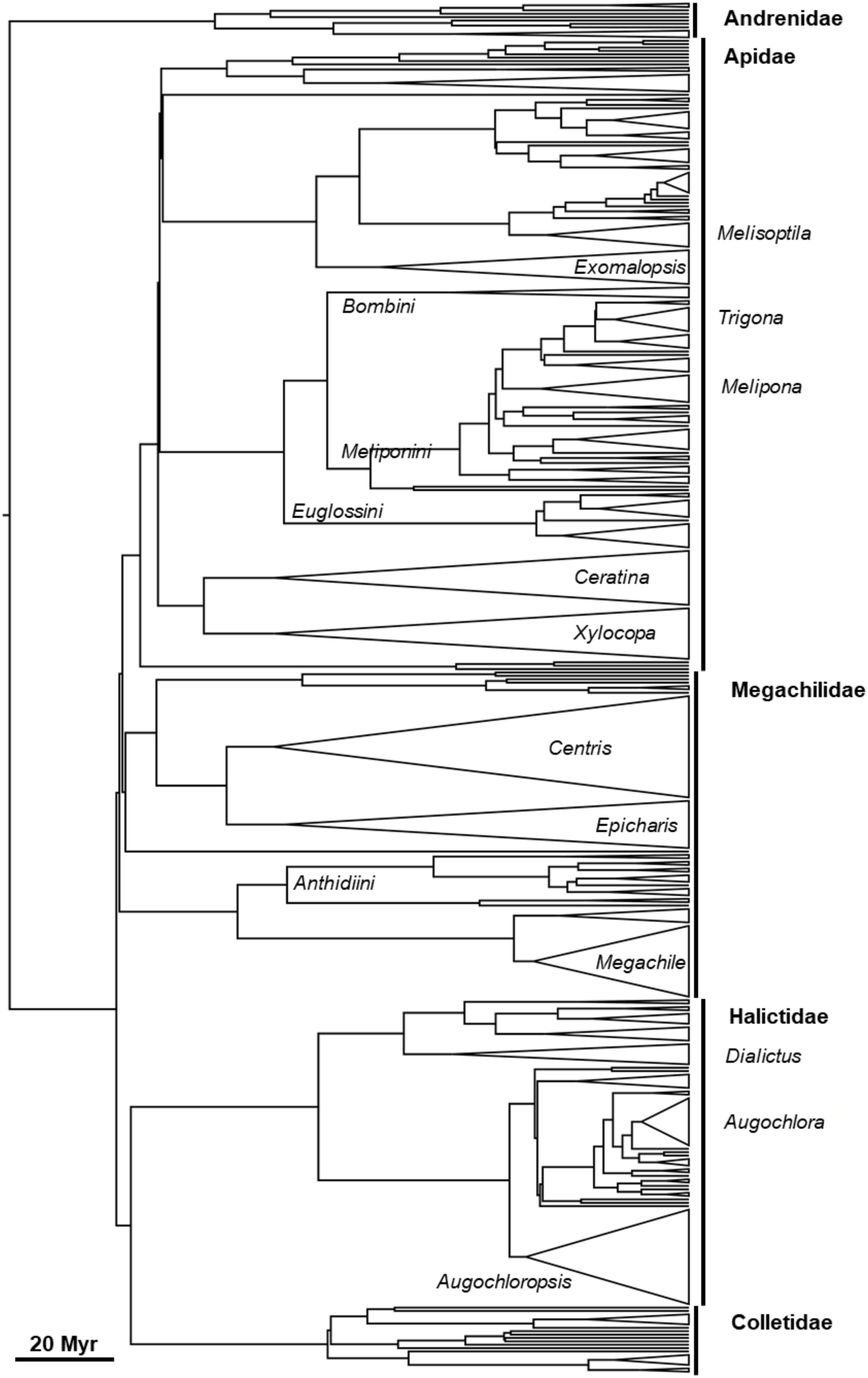 The ITD was obtained for 85% of the analyzed bee species. A phylogenetic tree with all the genera analyzed in this study, including their branch length, can be found in Figure 4.