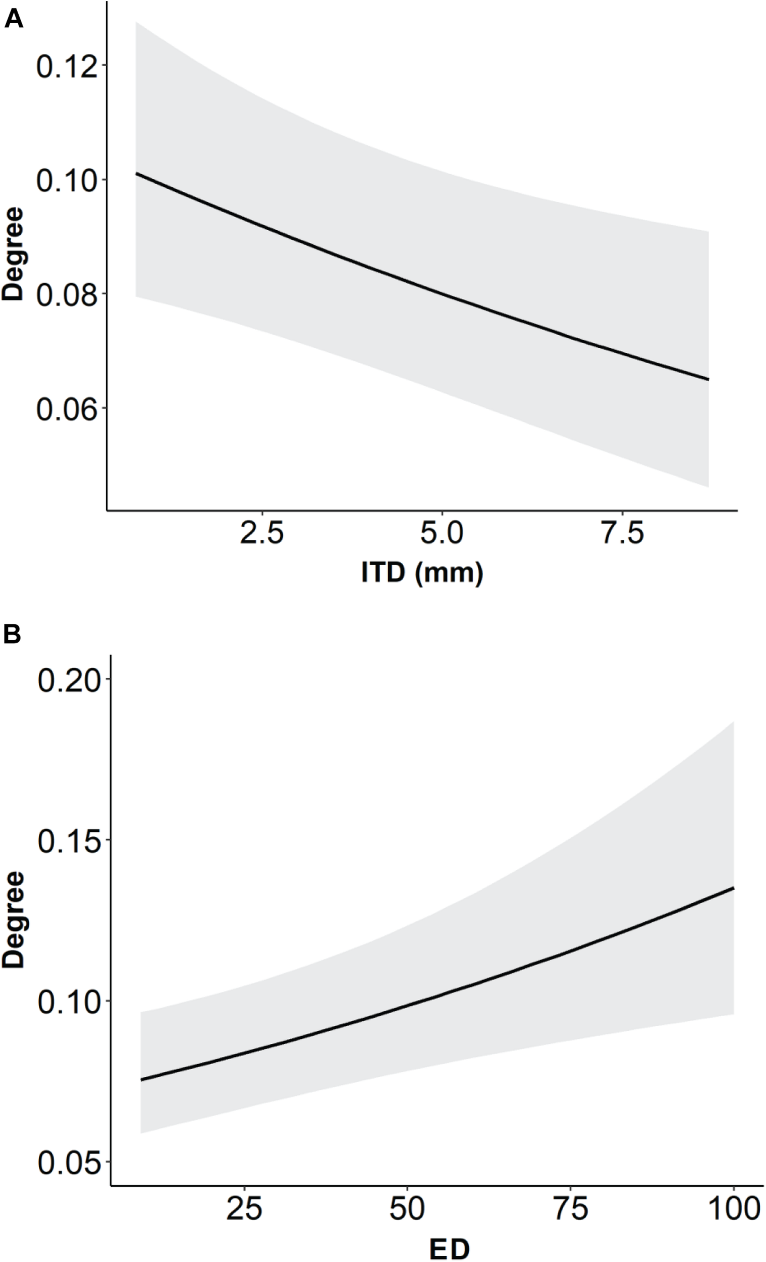 Graphical representation of the degree (number of partners) in relation to the (A) ITD and (B) evolutionary distinctiveness (ED) of the selected model (Model 1 – see Table 3). A lower degree value indicates higher specialization. Shaded areas represent 95% confidence intervals.