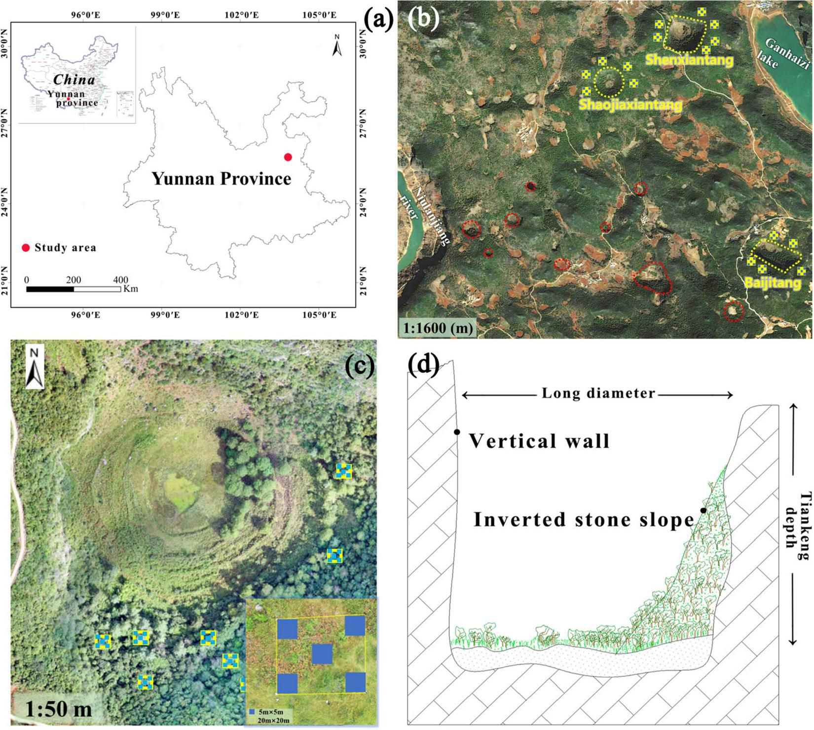 Study region (a,b), top view of karst tiankengs with sample design (c), and longitudinal profile of karst tiankeng (d). (a) Map source: Natural Resources Standard Map Service Review Number: GS(2019)1686. Sampled area are highlighted in yellow (b), among them, circle: karst tiankeng groups, yellow circle: karst tiankeng occurring in the study area, squares: schematic of surface sample.