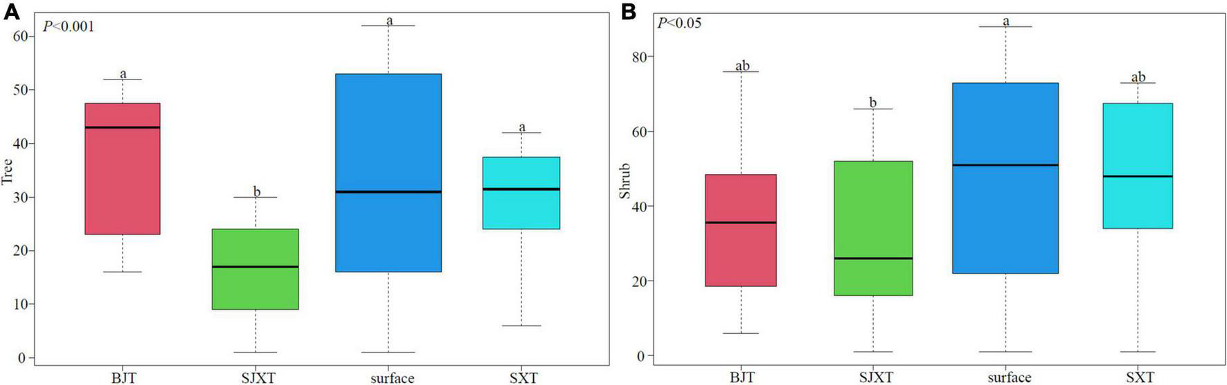 Differences in species composition of forests between sites, with different lowercase letters indicating significant differences. (A) Tree, (B) shrub.