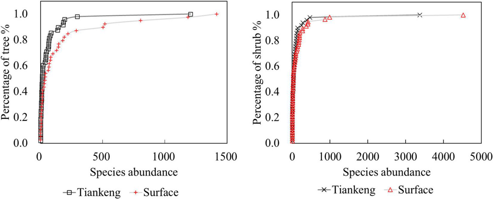 Two species growth of the community within and outside the karst tiankengs presented a fixed S-shaped empirical cumulative distribution function (ECDF), with a high percentage of rare species in different topographies (Figure 3). A higher proportion of trees and shrubs in karst tiankengs than that of the surface, and the overall proportion of shrubs is higher than that of trees. Furthermore, according to the Wilcoxon rank sum test, in the tree and shrub layer, there were significant variations (p < 0.01) in the ECDFs within and outside degraded karst tiankeng.