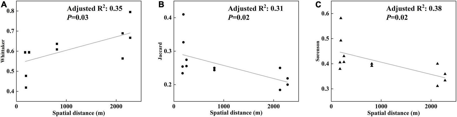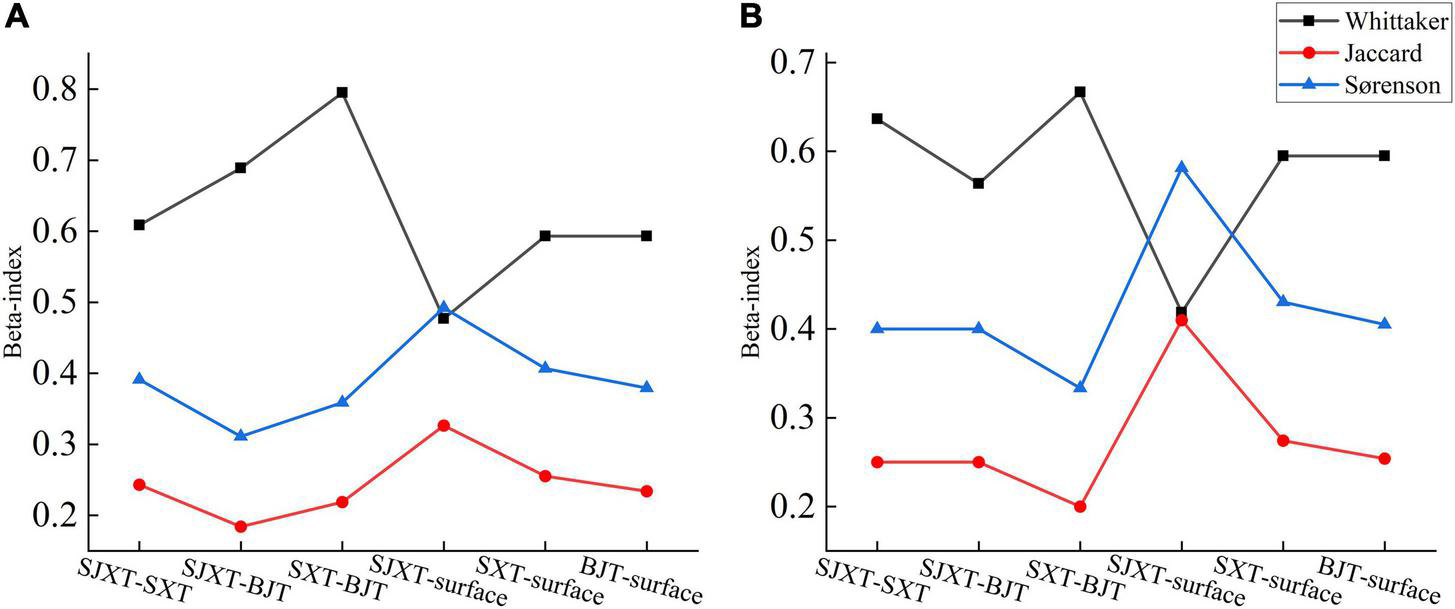 The beta-diversity index represents the simplest way to determine species differences among communities and is generally combined with the similarity coefficient (Jian et al., 2018). The Whittaker index, Jaccard index, and Sørenson index are the most widely used, suggesting differences in species composition among communities under environmental gradients. The value of the similarity coefficient ranges from 0 to 1. If it is equal to 0, then the two community species are completely different; if it is 1, then the two community species are identical.