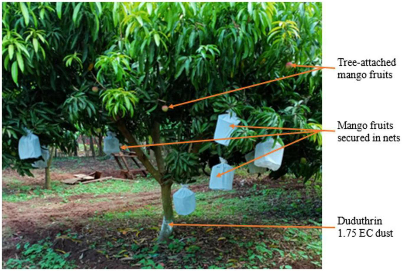 Depending on the mango variety and fruit size, each net cage could hold at least four mangoes. From each mango tree, at least 32 mango fruits were secured. The caged mango fruits were inspected every week until they were physiologically mature and ready for use in the trials.