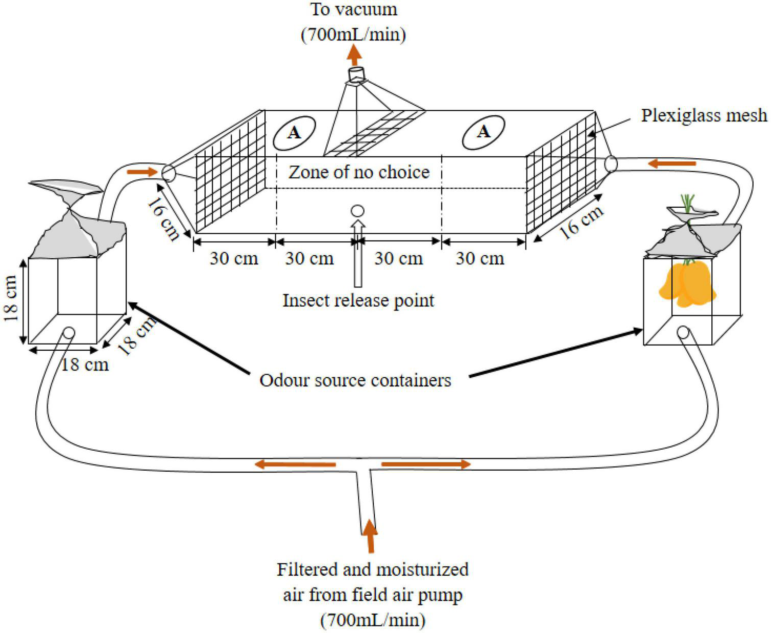 Dual-choice olfactometer assays were carried out under the field conditions at Mwea East Sub-county, Kirinyaga County, Kenya (00°41′39.8″S, 037°24′26.7″E, 1,158 m ASL) to evaluate the responses of fruit flies and parasitoids to mango fruit volatiles, in situ, following the methods described by Nyasembe et al. (2012) and Miano et al. (2022) with some modifications. The dual-choice olfactometer and the mango holders were made of Perspex glass (Figure 2).