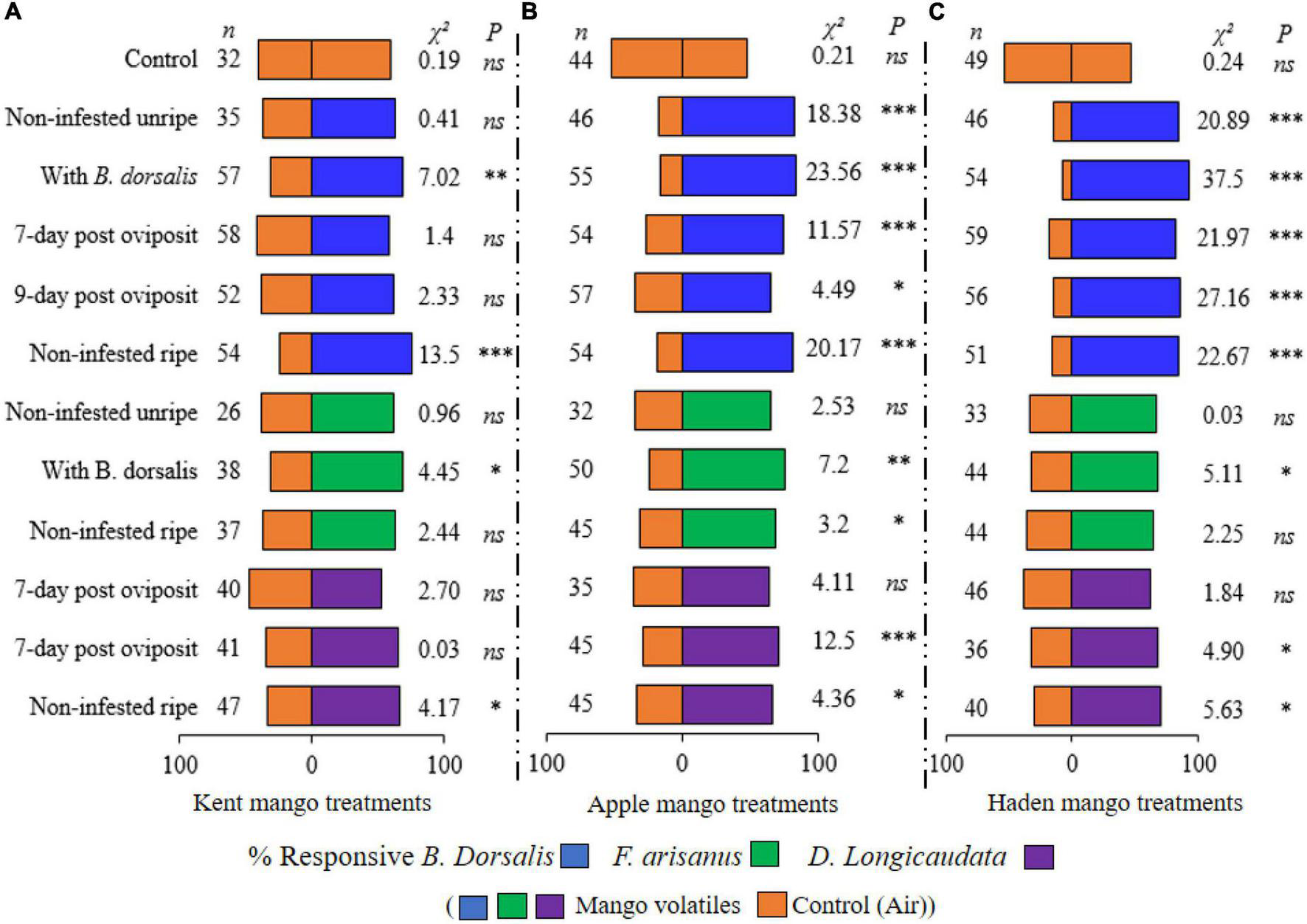 Figure 3. Responses (%) of Bactrocera dorsalis (blue), Fopius arisanus (green), and Diachasmimorpha longicaudata (pink) to different treatments of Kent (A), Apple (B), and Haden (C) mango volatiles. n = numbers of responsive insects out of the 70 tested; χ2, Chi-square; ns, no significant difference, and *, **, *** = significance differences with P < 0.05, 0.01, 0.001, respectively (chi-square goodness of fit test).