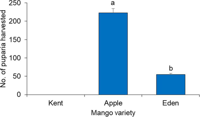 Figure 4. Number of puparia harvested from the different mango varieties. Bars capped with different letters are significantly different (Pearson’s Chi-square test followed by Chi-square multi-comparison test in RVAideMemoire).