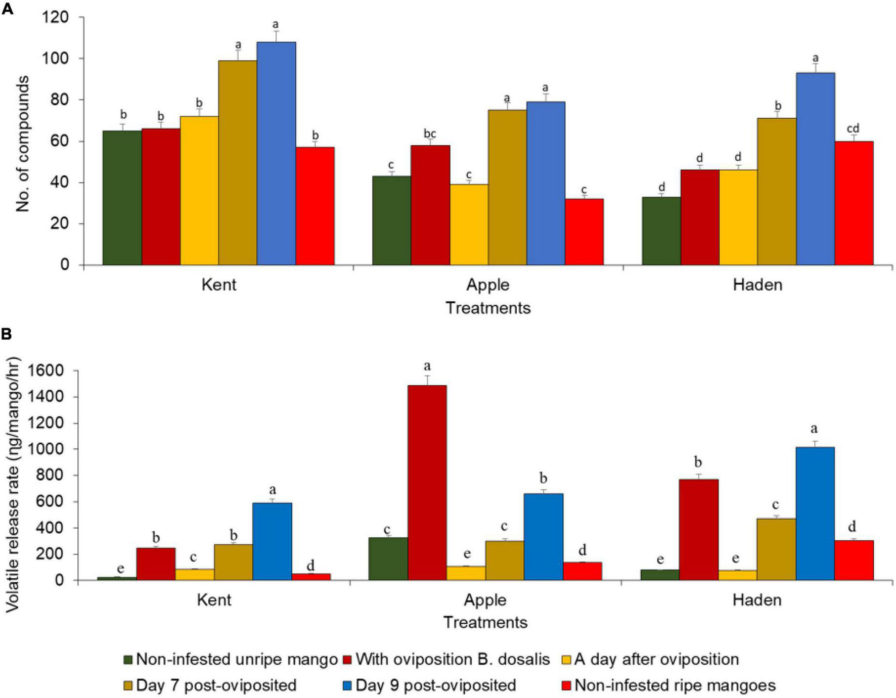 Figure 5. (A) The number of volatile organic compounds detected from the different mango varieties under the six different treatments. Bars capped with different letters, for the same mango variety, are significantly different (Pearson’s Chi-square test followed by Chi-square multi-comparison test in RVAideMemoire). (B) Totals of the average volatile release rates (ηg/mango/h) of the different mango treatments of the three varieties. Bars capped with different letters for the same mango variety are significantly different (Kruskal-Wallis rank-sum test followed by post hoc Dunn test for pairwise comparison).