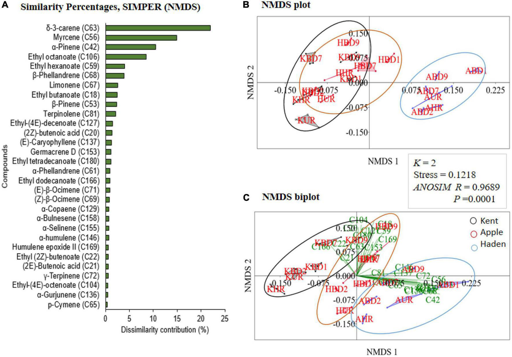 Figure 6. (A) Similarity percentage (SIMPER) of the non-metric multidimensional scaling (NMDS) showing the first 30 top most discriminant volatiles. (B) The NMDS plot shows the scattering of the treatments from the three varieties of mangoes. (C) The NMDS biplots for the differentiation of the discriminant volatiles in the treatments (K, Kent; A, Apple; H, Haden; BD, Bactrocera dorsalis; UR, non-infested unripe mango; HR, non-infested ripe mango; 1, 2, 7, and 9 = number of days from the day of B. dorsalis oviposition).