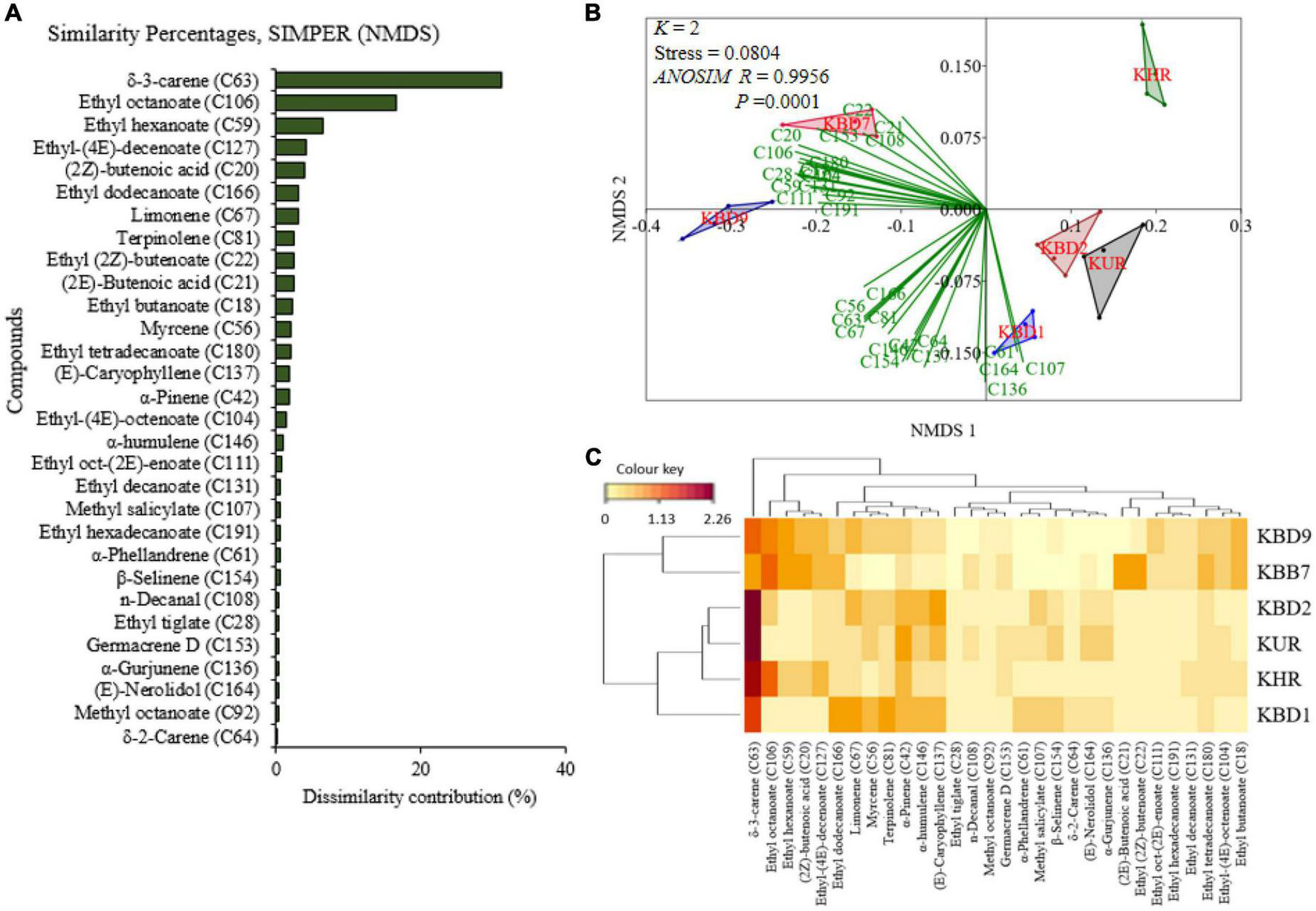 Figure 7. Panel (A) is the graphical representation of the 30 top most discriminant volatiles in their decreasing importance based on the non-metric multidimensional scaling’s (NMDS) similarity percentage (SIMPER). Panel (B) is the NMDS biplots for the differentiation of the 30 selected compounds and how they correlate to the mango treatments, while panel (C) is a heatmap clustering of the auto-scaled volatile release rate (y = log10x + 1) of the 30 compounds. The darker the brown color the higher the release rate (KBD1-Kent mango with ovipositing Bactrocera dorsalis; KHR-non-infested ripe Kent mango; KUR-non-infested unripe Kent mango; KBD2-Kent mango a day after oviposition; KBD7-day 7 post-oviposition KBD9-day 9 post-oviposited mangoes).