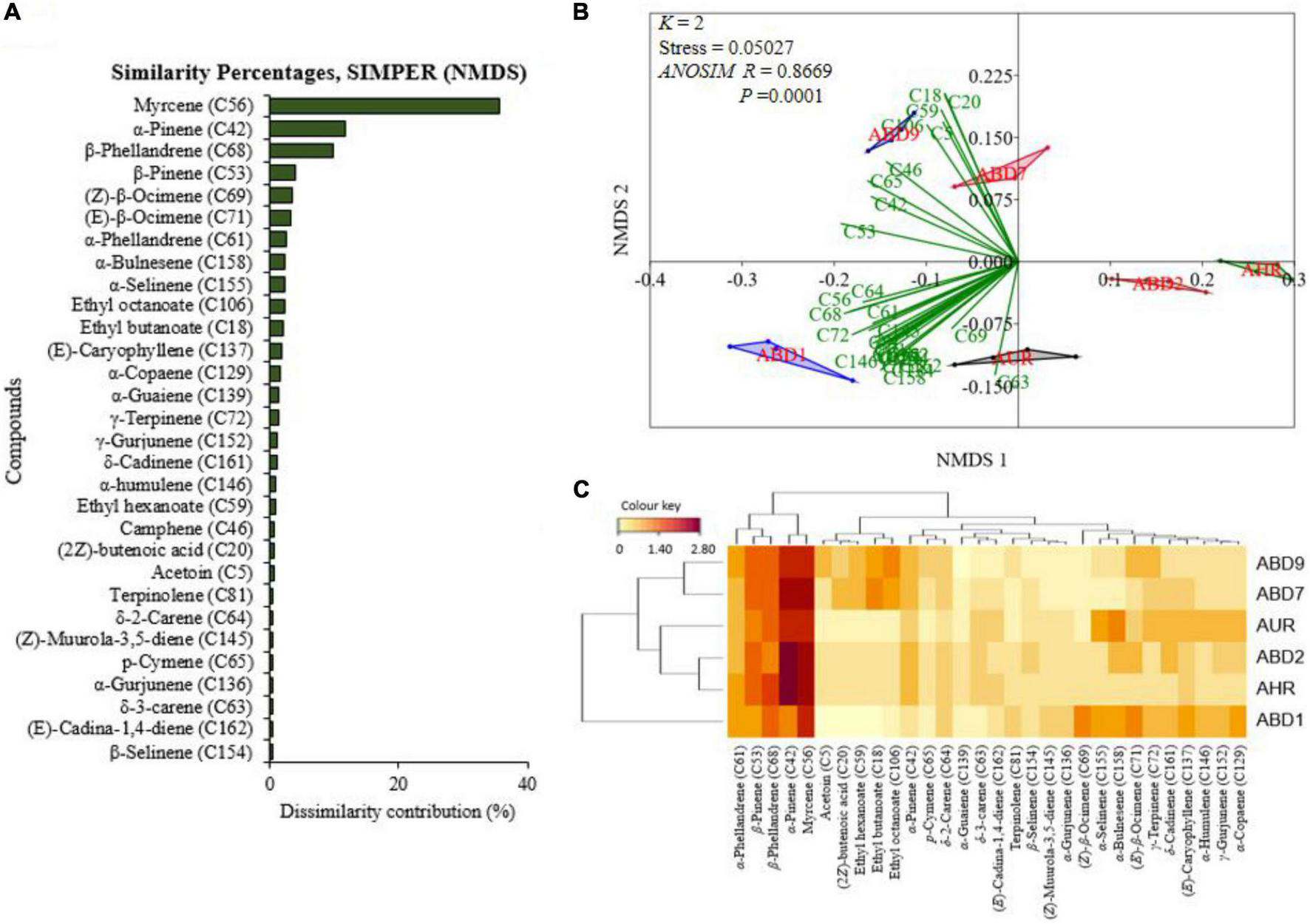 Figure 9. Panel (A) is a graphical representation of the 30 top most discriminant volatiles in their decreasing importance based on the non-metric multidimensional scaling’s (NMDS) similarity percentage (SIMPER). Panel (B) is NMDS biplots for the differentiation of the selected compounds and how they correlate to the mango treatments, while panel (C) is a heatmap clustering of the auto-scaled volatile release rate (y = log10x + 1) of the 30 discriminant compounds. The darker the brown color the higher the release rate (ABD1-Apple mango with ovipositing Bactrocera dorsalis; AHR-non-infested ripe Apple mango; ABD2-Apple mango a day after oviposition; AUR-non-infested unripe Apple mango; ABD7-day 7 post-oviposited; and ABD9-day 9 post-oviposited mangoes).