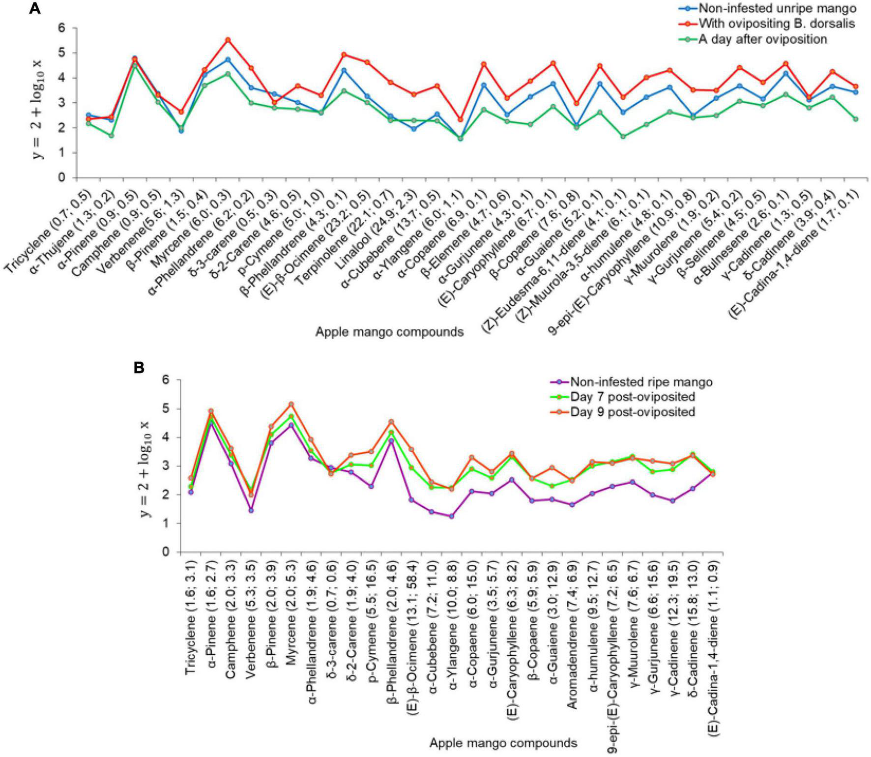 The relative release rates of the common compounds present in the headspace of non-infested unripe mangoes or non-infested ripe mangoes were selected from the different treatments of the same mango variety and compared as follows: (i) mango with ovipositing B. dorsalis and mango a day after oviposition relative to those of non-infested physiologically mature unripe mango and (ii) day 7 and day 9 post-oviposited mangoes relative to those of non-infested ripe mangoes. A Kruskal-Wallis rank-sum test was performed to test for the difference in headspace volatile release rates in each of the three treatments followed by the Dunn test for pairwise comparison to test where the differences reported originated from. Furthermore, the averages of the compounds that were common in volatiles as selected in (i) and (ii) were auto-scaled using y = 2 + log10x and their number of fold changes in the quantities relative to either those of non-infested unripe mangoes or non-infested ripe mangoes calculated, where the number of fold changes was given by and then visualized using line graphs.