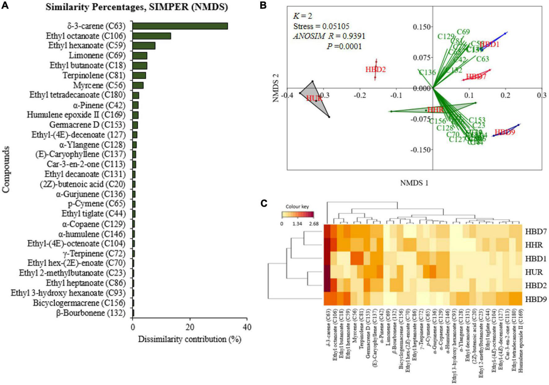 Figure 11. Panel (A) is a graphical representation of the 30 top most discriminant volatiles in their decreasing importance based on the non-metric multidimensional scaling’s (NMDS) similarity percentage (SIMPER). Panel (B) is NMDS biplots for the differentiation of the 30 selected compounds showing how they correlate to the mango treatments while (C) is a heatmap clustering of the auto-scaled volatile release rate(y = log10x + 1), of the compounds. The darker the brown color the higher the release rate (HBD9-day 9 post-oviposition; HBD2-Haden mango a day after oviposition; HUR-non-infested unripe Haden mango; HBD1-Haden mango with ovipositing Bactrocera dorsalis; HHR-non-infested ripe Haden mango, and HBD7-Haden mango on day 7 post-oviposition).