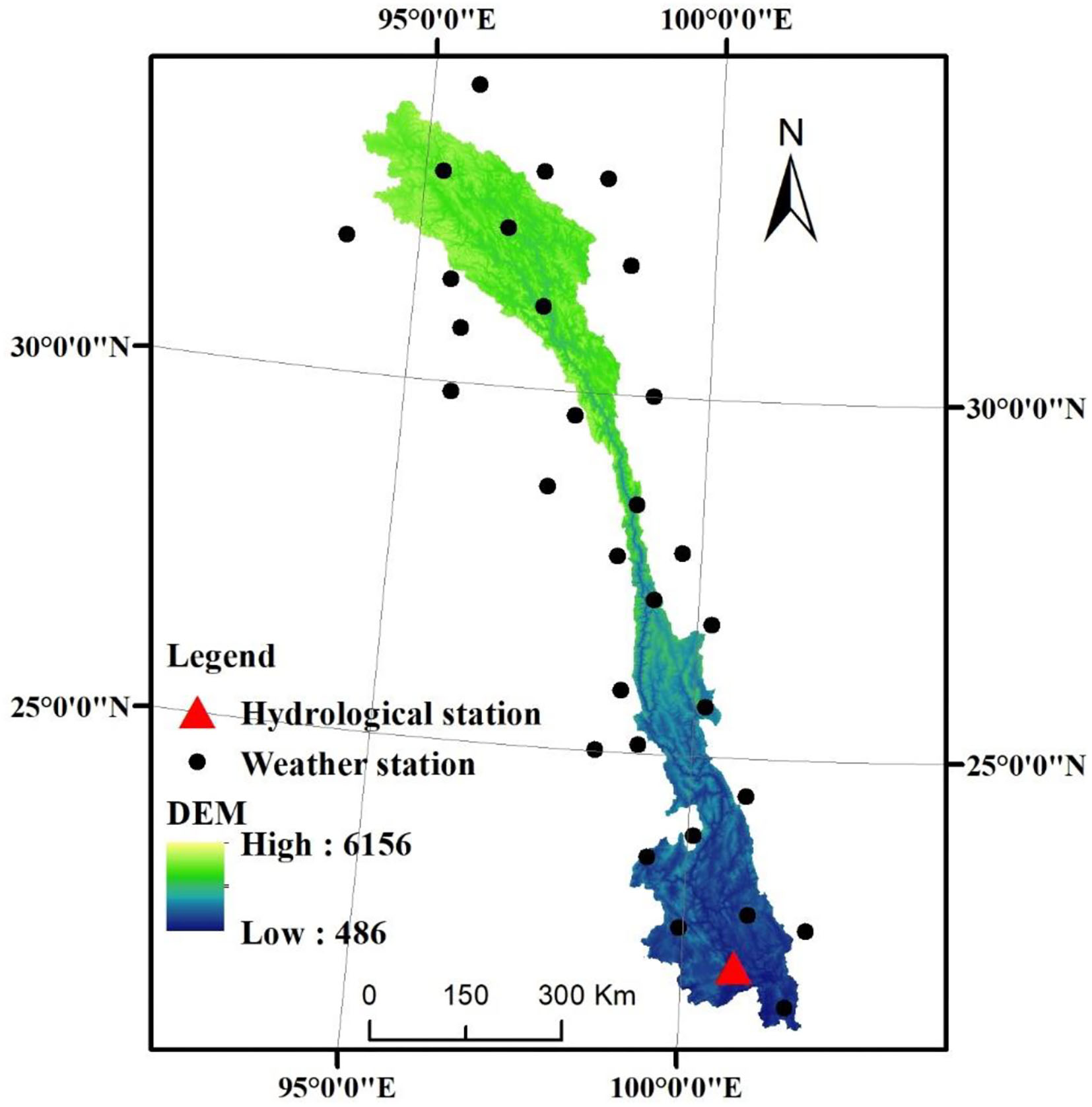 The location of hydro-meteorological stations in and around the study region.