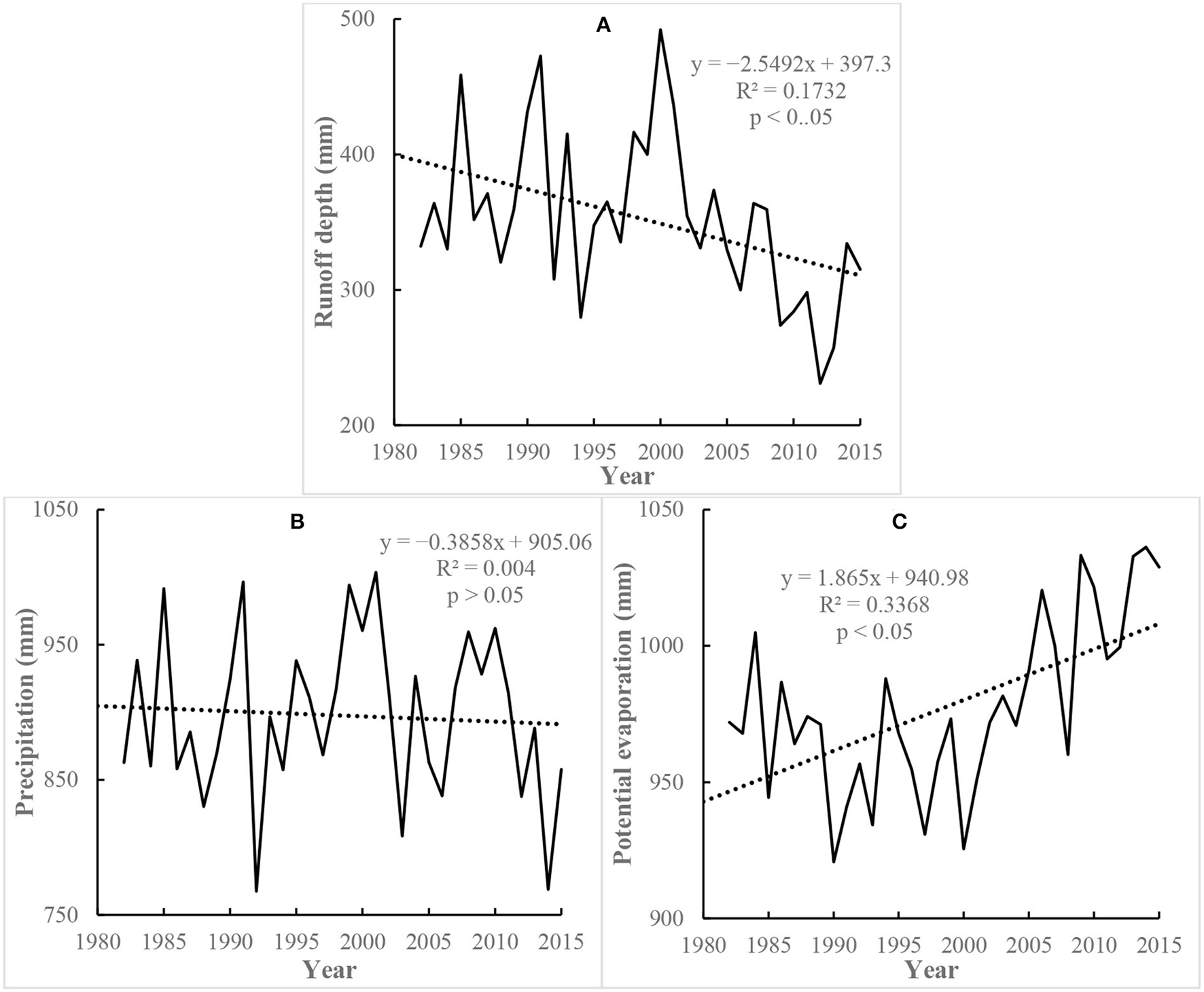 During the period of 1982–2015, the precipitation showed a non-significant decreasing trend (p > 0.05), with a slope of −0.3858 mm/a (Figure 2B). From 1982 to 2015, the precipitation in 2001 was the maximum (1,003.63 mm) and that in 1992 was the lowest (767.51 mm).