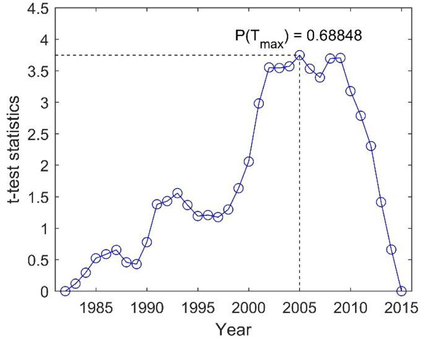 In this study, the BG segmentation algorithm is used to distinguish the abrupt years of the annual runoff data from 1982 to 2015 in the LCRB (Figure 3). P0 is set to 0.68 and l0 is set to 25. From Figure 3, we found that t-test statistics takes the largest value in 2005 and it is ~3.75, which showed that the annual runoff of the Yunjinghong hydrological station changed dramatically in 2005 and its mutation year may be fixed as 2005. According to formula (4), we calculated the significance probability P(Tmax), corresponding to the maximum value (Tm) of t-test statistics, by the Monte Carlo simulation. If P(Tmax) > P0, we believe that the sudden change in runoff is significant. The result showed that the significance probability P(Tmax), corresponding to the maximum value (Tm) of t-test statistics (2005), is 0.688 > 0.68. This result further proves the reliability of the result that the annual runoff series data of the Yunjinghong hydrological station mutated in 2005.