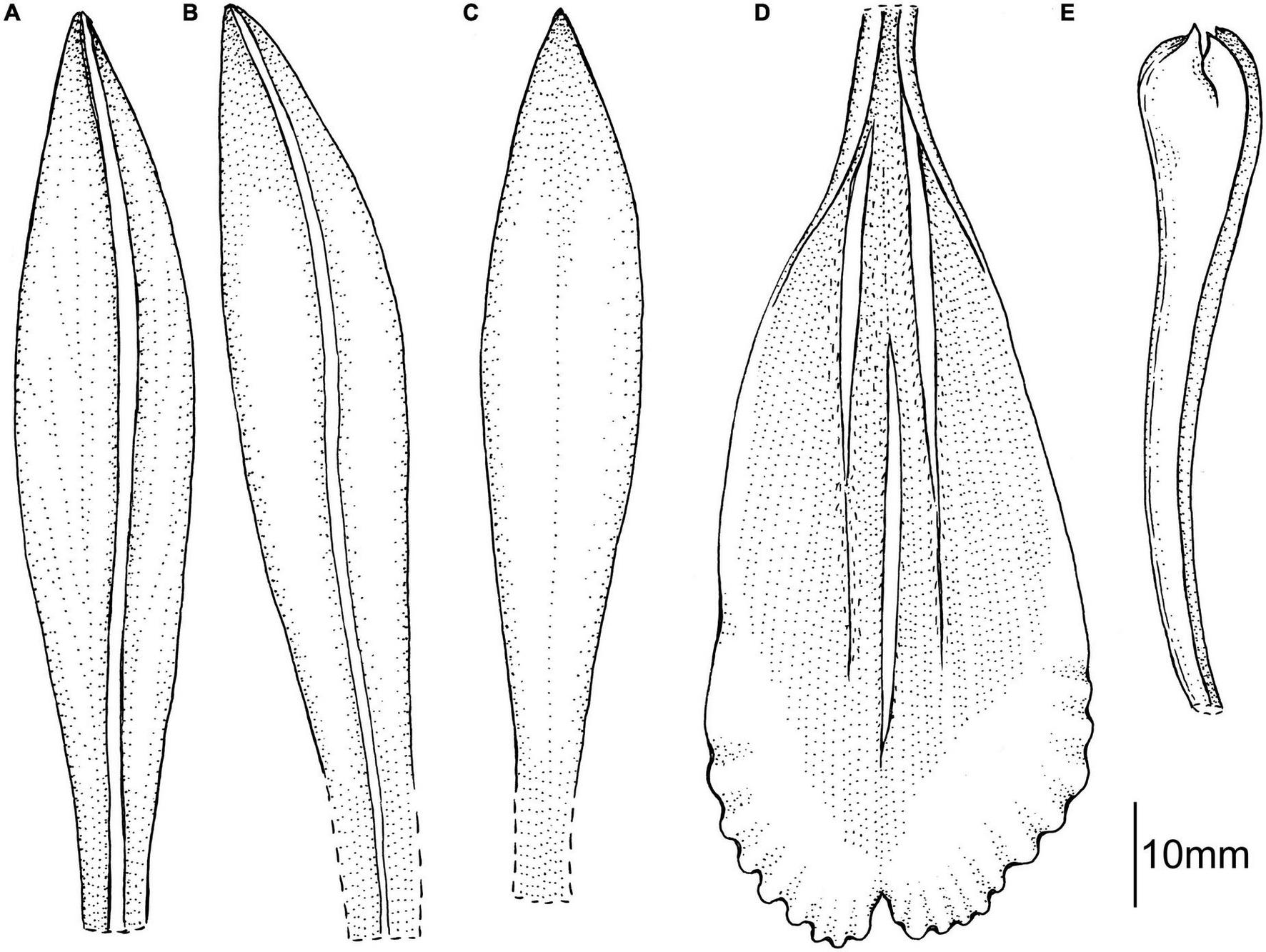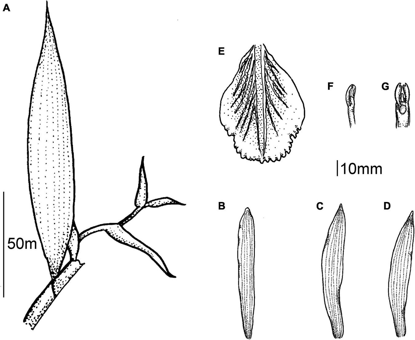 Sobralia chrysantha Lindl. (A) apical part of stem with inflorescence, (B) dorsal sepal, (C) petal, (D) lateral sepal, (E) lip, (F) apical part of gynostemium, side view, and (G) apical part of gynostemium, front view [drawn by P. Baranow; panels (A,E–G) from the isotype, lip, and gynostemium redrawn from the drawings left on the herbarium sheet; panels (B–D) from Schlim 1188].