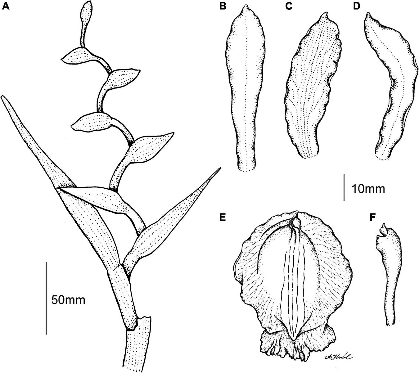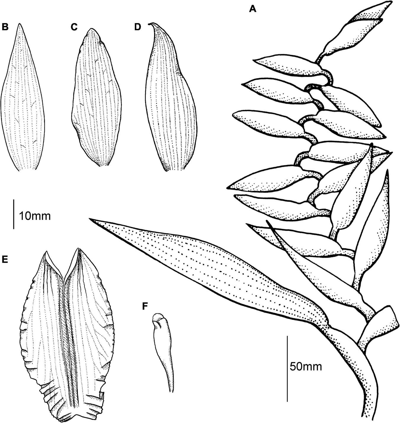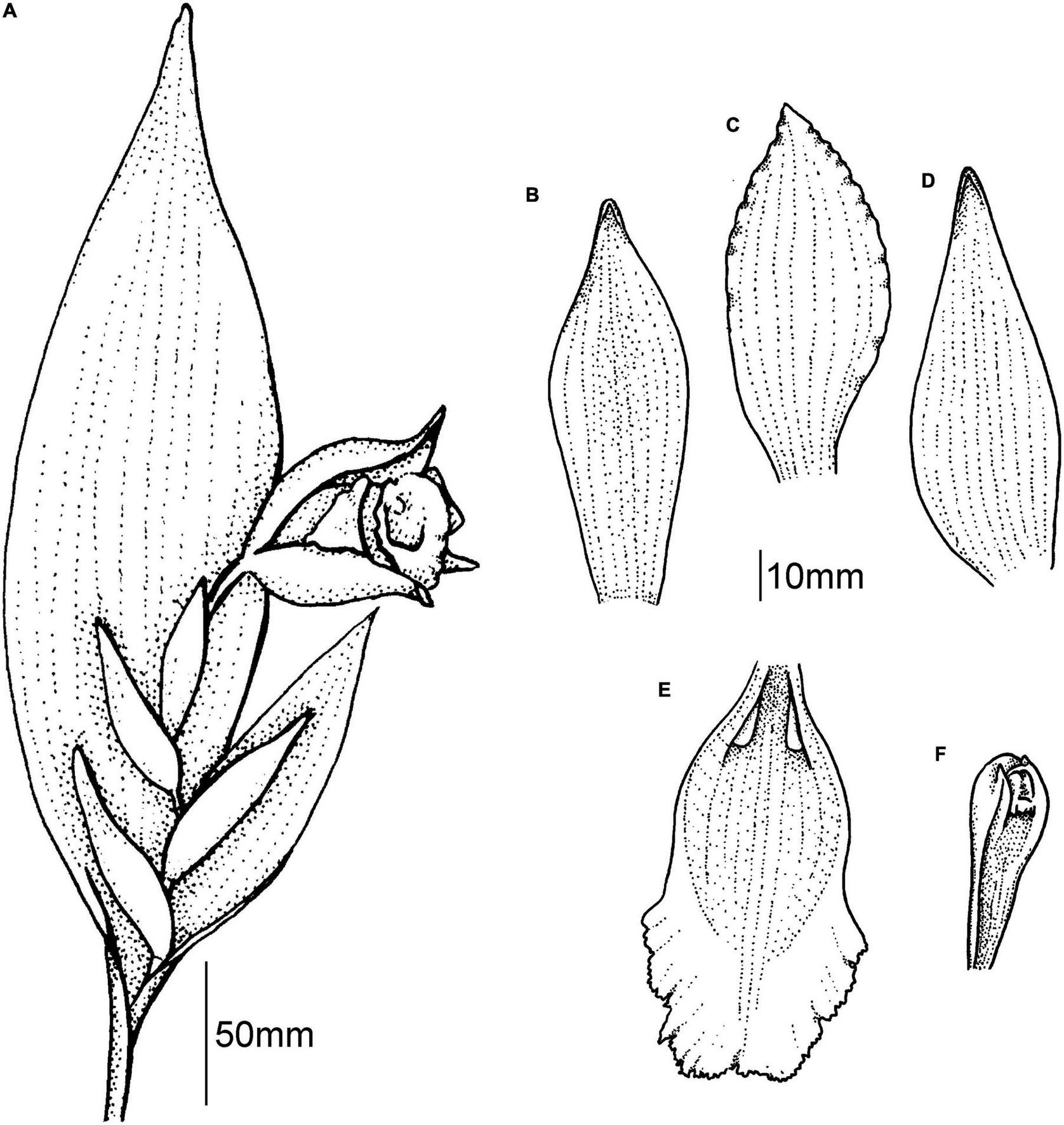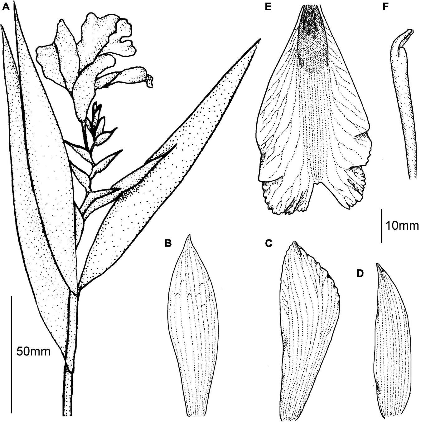 Sobralia chrysoleuca Rchb. f. (A) apical part of stem with inflorescence, (B) dorsal sepal, (C) petal, (D) lateral sepal, (E) lip, and (F) gynostemium (drawn by P. Baranow from the holotype).