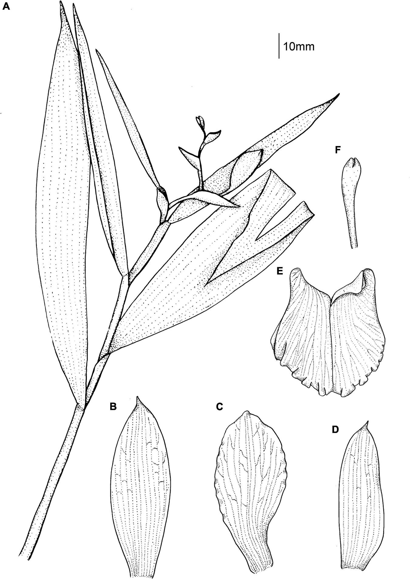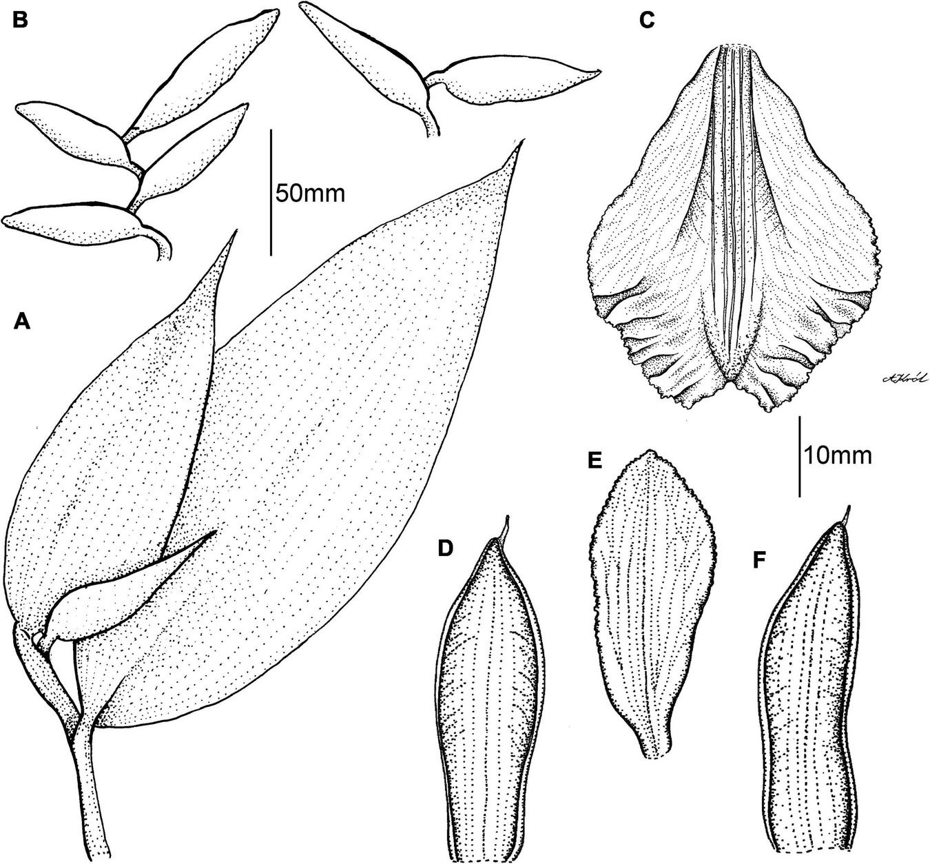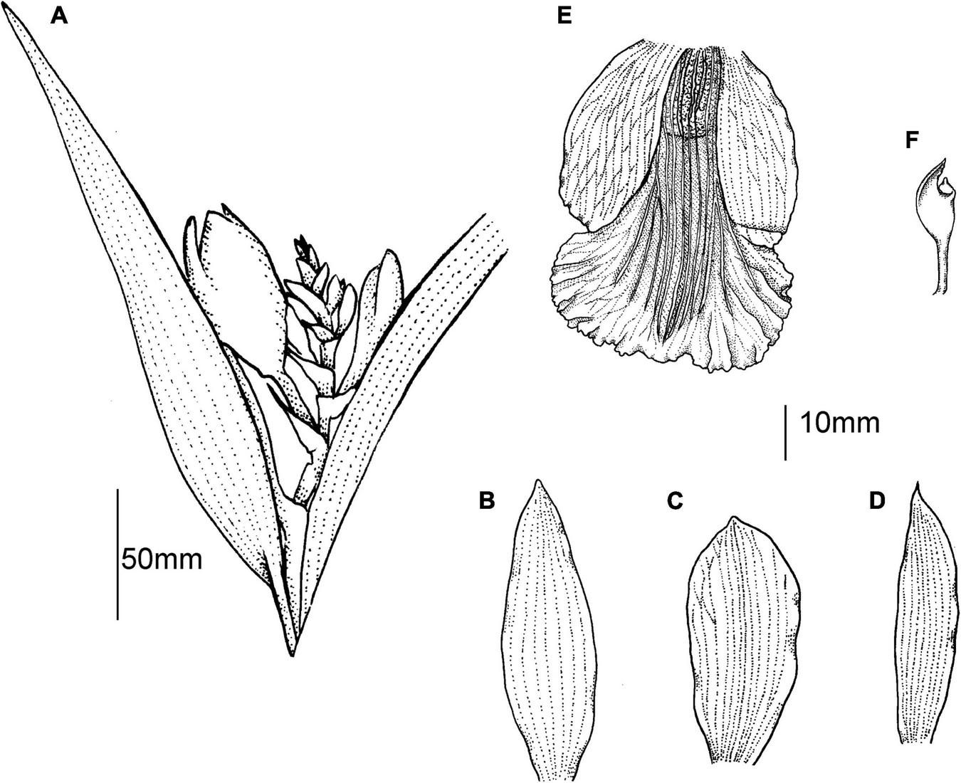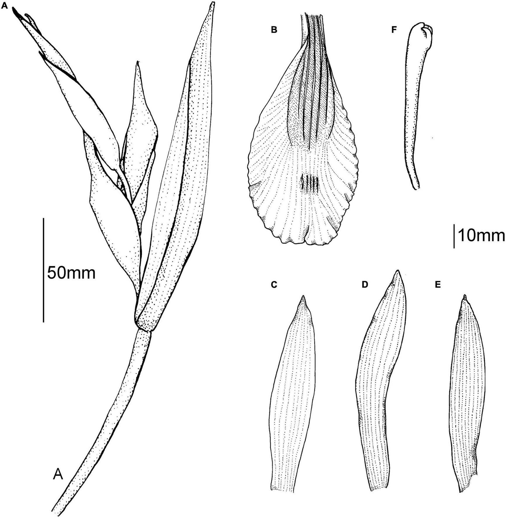 Sobralia chrysoleuca Rchb. f. (A) apical part of stem with inflorescence, (B) dorsal sepal, (C) petal, (D) lateral sepal, (E) lip, and (F) gynostemium (drawn by P. Baranow from the holotype).