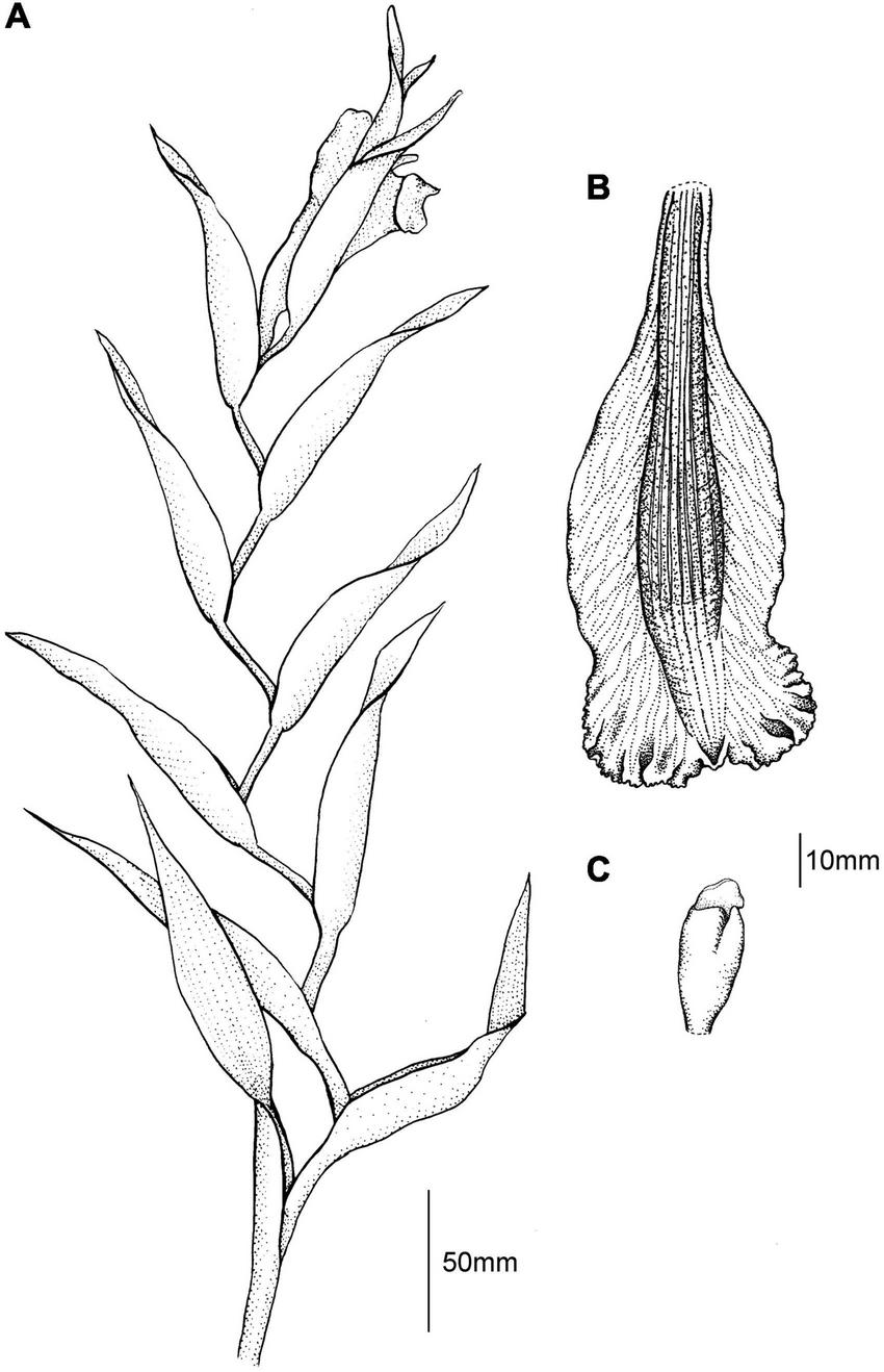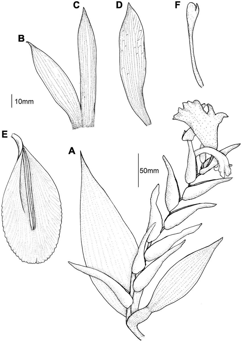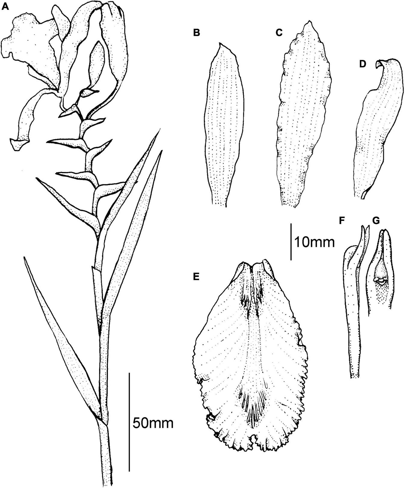 Plants height unknown, probably well over 100 cm tall. Leaves up to 25 cm long and 4 cm wide, lanceolate to elliptic-lanceolate, acute, plicate. The leaf subtending the rachis up to 10 cm long. Inflorescence ca 10 cm long, rachis inconspicuously flexuose. Floral bracts 15–50 mm long, narrowly lanceolate-triangular, acute to acuminate. Flowers yellow, large. Dorsal sepal 83 mm long, 12 mm wide, oblong-ligulate to linear, subobtuse. Lateral sepals 83 mm long, 12 mm wide, obliquely linear-lanceolate, shortly acuminate. Petals 85 mm long, 13 mm wide, obliquely linear-lanceolate to ligulate-lanceolate, shortly acuminate. Lip 70 mm long, up to 49 mm wide, broadly obovate to suborbicular-obovate in outline above cuneate base, rounded at apex, indistinctly denticulate and undulate along margins in the upper half, attenuate and canaliculate toward base, without thickenings except the still middle rib. Gynostemium 52 mm long, clavate, staminodes oblong elliptic, straight, much exceeding the anther, with a deep wing at their back and an oblique emargination, apex falcate, blunt (Figure 2).