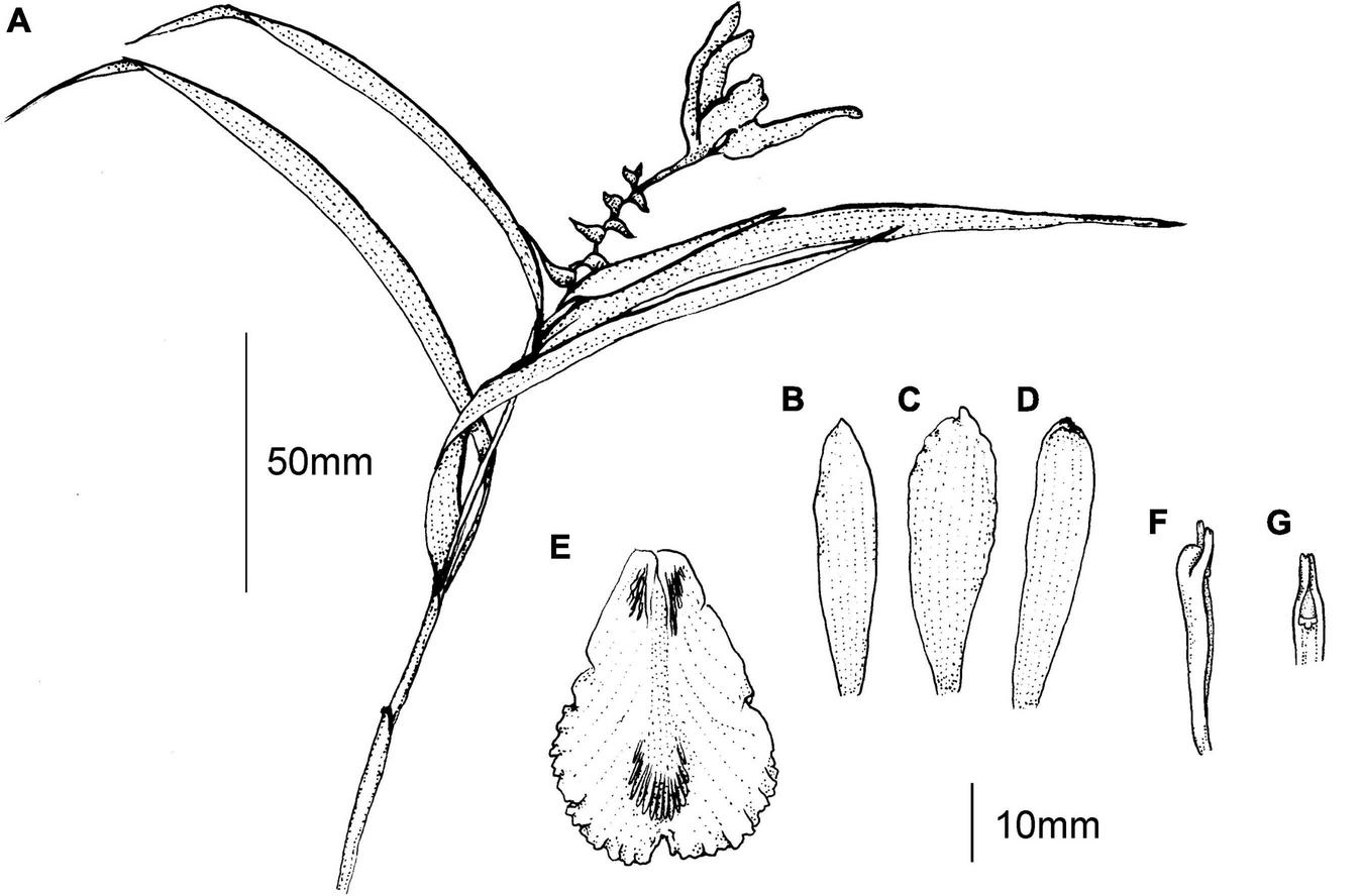 Erect plant, height unknown, probably well above 100 cm tall. Leaves 30 cm long and 4 cm wide, oblong lanceolate to linear-lanceolate, acuminate, coriaceous, strongly plicate. Inflorescence 12 cm long, ca. 15-flowered, rachis erect, nearly straight to somewhat flexuose. Floral bracts 25–30 mm long, triangular-lanceolate, acuminate. Ovary 30 mm long. Flowers white or light yellow with distinct, deep yellow or orange dot on the apical part of lip. Dorsal sepal 68 mm long, 18 mm wide, lanceolate, acute. Lateral sepals 60 mm long, 15 mm wide, oblong-lanceolate, inconspicuously oblique, acute. Petals 57 mm long, 25 mm wide, widely oblong or elliptic, somewhat oblique, acute. Lip 60 mm long, 45 mm wide, oblong, constricted below the middle and inconspicuously bilobed at the apex, margins in apical part irregularly crenate and crispate, disk with nine keels running along the central veins from base almost to the apex, base papillate. Gynostemium 36 mm long, slender but with large and wide, massive, wing-like, triangular, oblique, acute apical stelidia, which distinctly exceeding the anther apex (Figure 3).