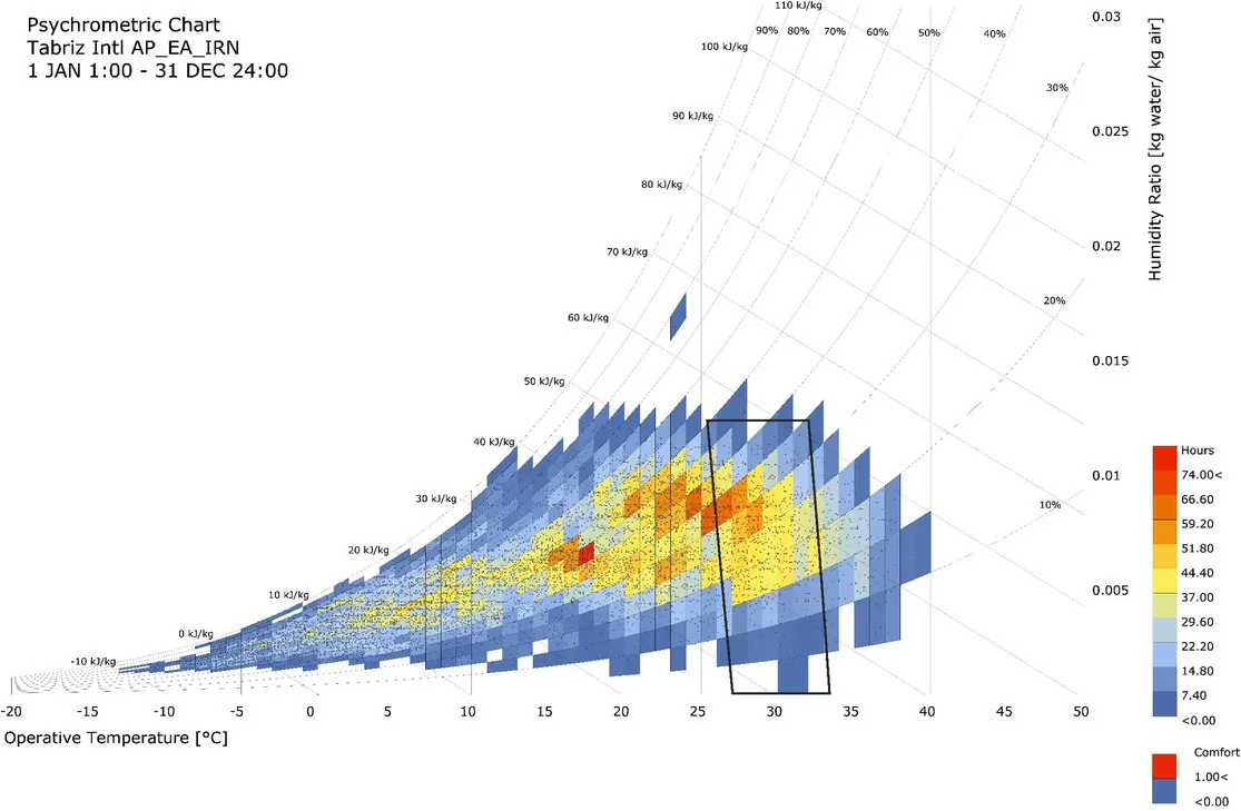 The four indices of UHI intensity measurement—Dry Bulb Temperatures, Dew Point Temperature, Relative Humidity and Wind Speed—were investigated in order to understand their effect on the type and form typologies and then these indicators were introduced for statistical analysis and structural equation modeling. It should be noted that the two indicators of relative humidity and wind speed have been measured and evaluated using psychrometric chart and EPW data (Wind speed and relative humidity data are available in the EPW file of the studied area) (Table 3).