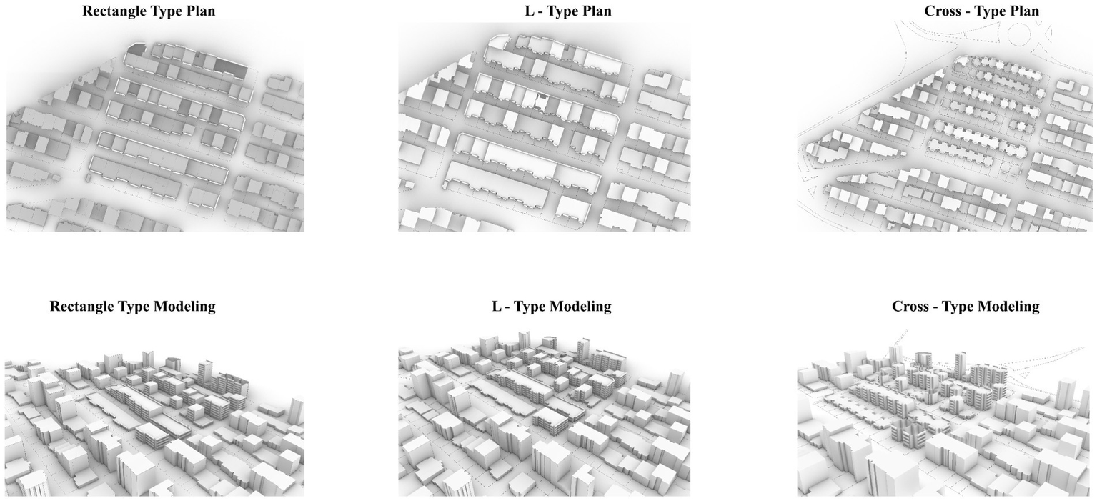 Step 3: Building Typologies. Then, according to the inputted data (residential, commercial and parking units), the type of building form was run in three forms: Rectangular-Type, L-Type and Cross-Type (Figure 3).